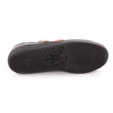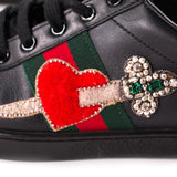 Details: Black Leather / Crystal Embroidered Pierced Heart Appliqué Over the Green and Red Grosgrain Web / Red and Green Ayers Snake Detail on the Back of Each Pair / Black Rubber Sole