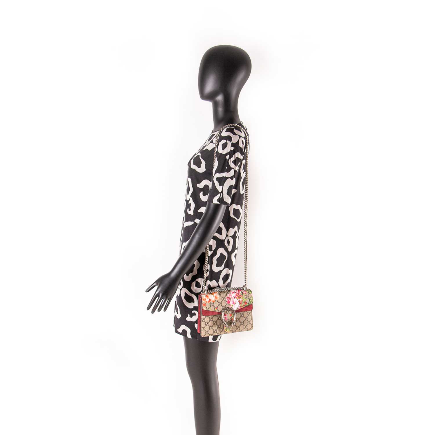 Details: Grey GG Coated Canvas / Flowers Print Embroidery Throughout / Silver-Tone Hardware / Burgundy Suede Accent / Dual Chain Link / Pocket at Underside Flap / One Compartment / Push-Lock Closure at Front Flap / Two-Headed Tiger Adornment