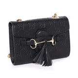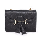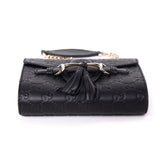 Details: Black Guccissima Leather / Gold Tone Hardware / Shoulder Strap With Chain Link Accent And Leather Pad / Natural Canvas Interior Lining / Single Slit Pocket At Interior Wall / Fold-in Flap Closure At Front / Horsebit And Tassel Embellishments At Front