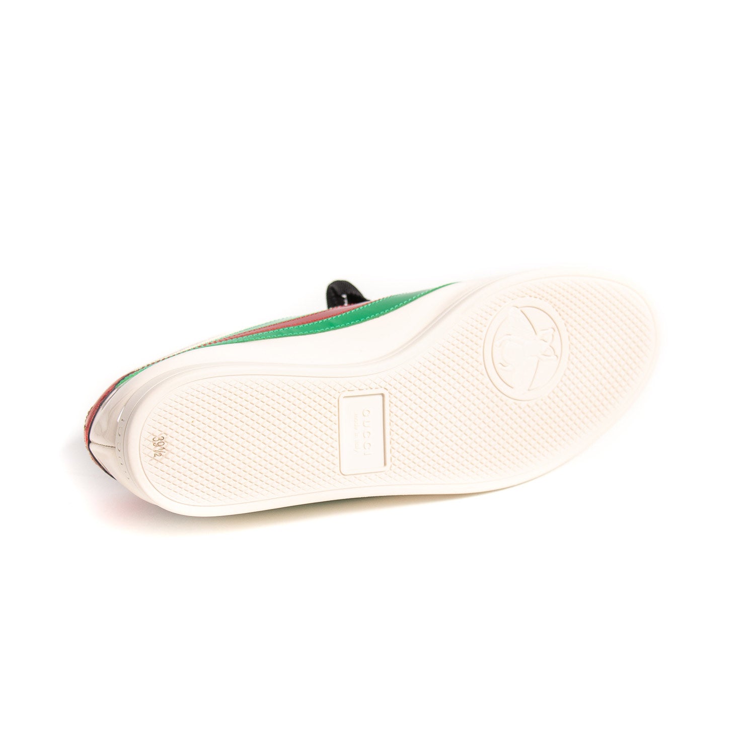 Details: Ivory Patent Leather / Low Top Sneaker / Green and Red Web Detail on Both Sides / Embellished Logo with Multicolor Crystal at Top / Lace-Up Closure