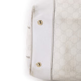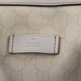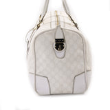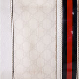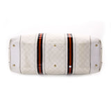 Details: White GG Leather / Gold-Tone Hardware / Dual Rolled Handles / Protective Studs at base / Zip Closure at Top / Navy Blue Nylon Lining / Zip Pocket at Interior / Red and Blue Web Stipe at Exterior / Push Lock Closure