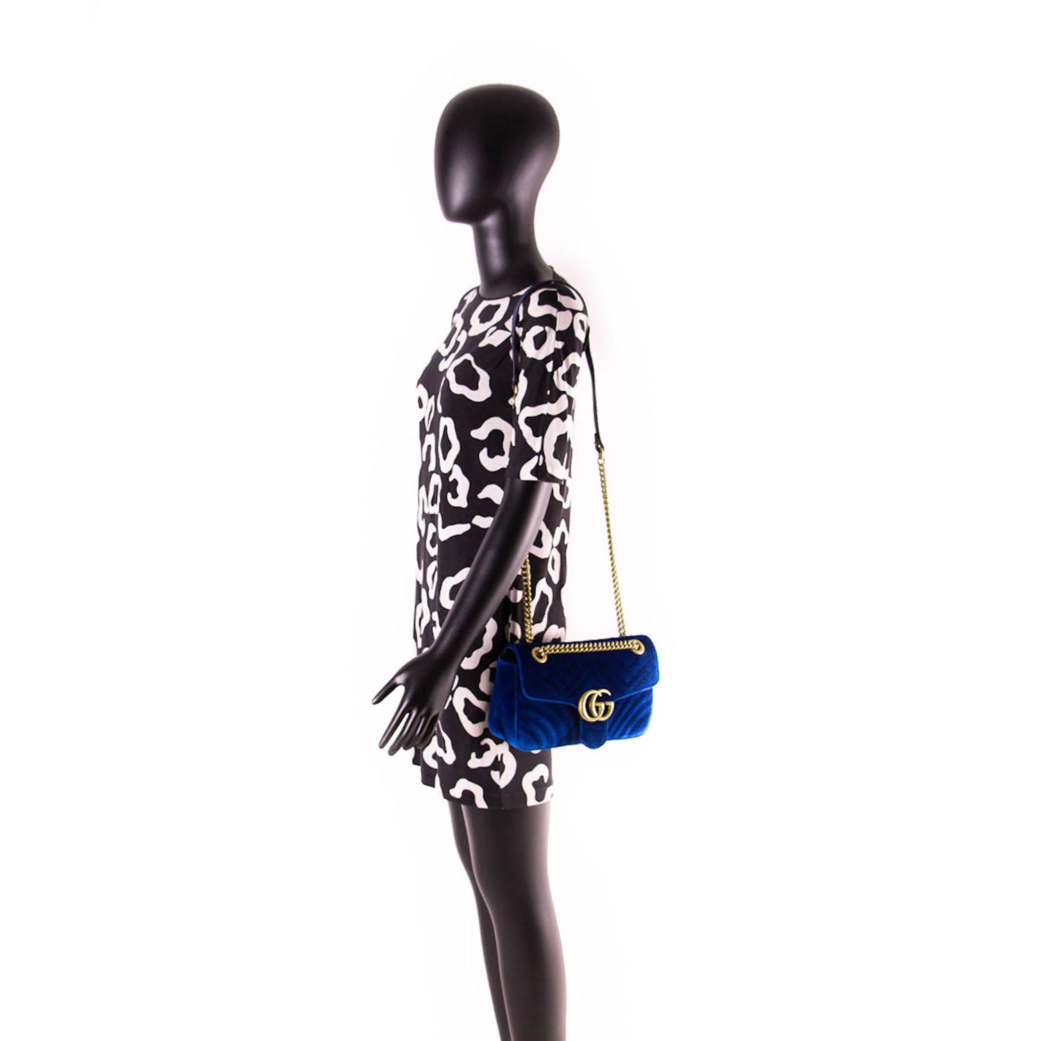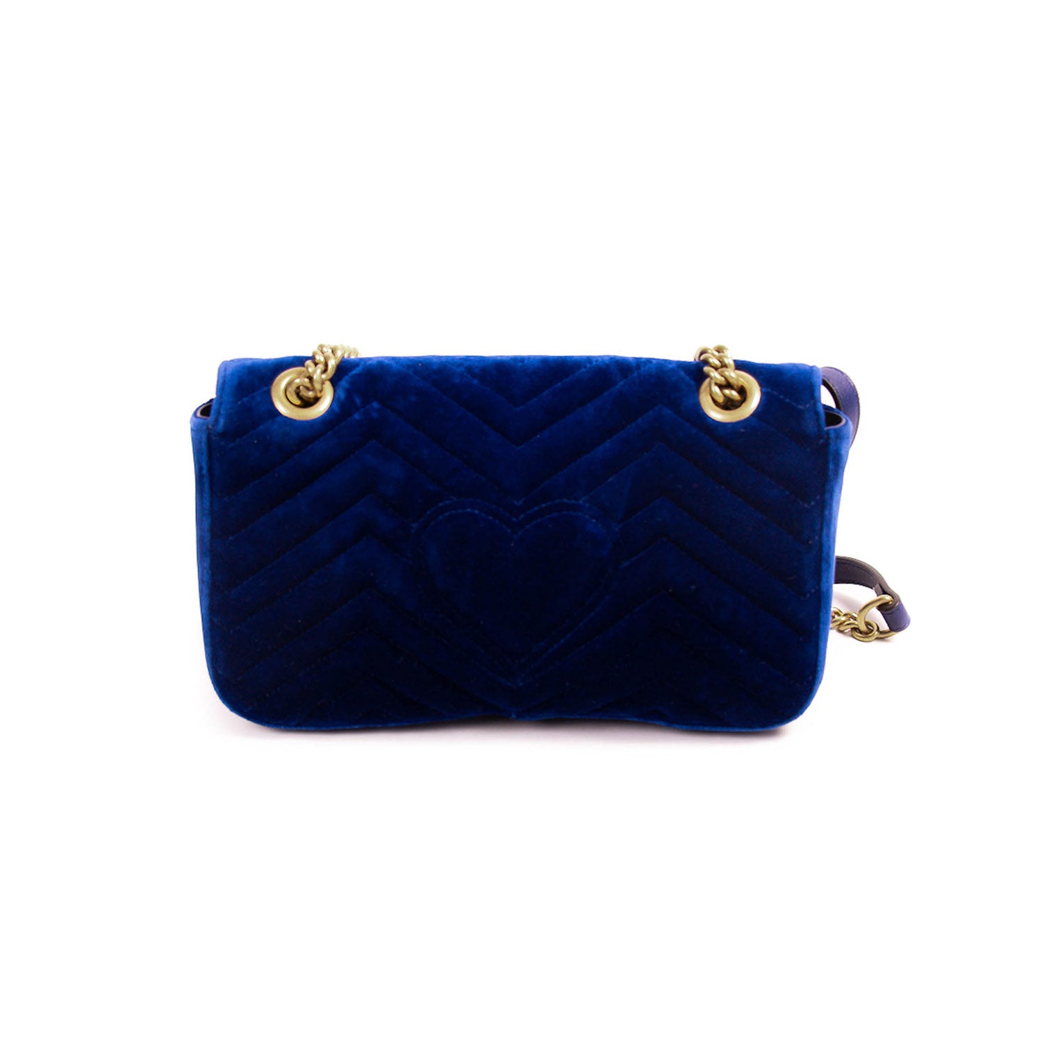 Details: Dark Blue Velvet / Antique Gold-Tone Hardware / Chain-Link and Leather Pad Shoulder Strap / Double G Logo at Front / Satin Interior Lining / Zipper Pocket at Inside / Push Button Flap Closure at Top