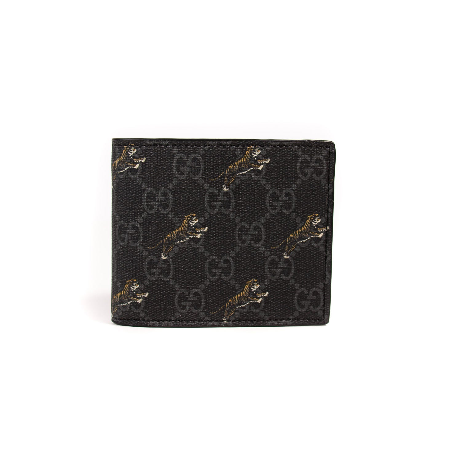 Details: Black and Grey GG Supreme Coated Cavas / Tiger Prints / Bi-Fold Shape / Dual Bill Compartment / 12 Card-Slots / Three Pockets / ID Pocket / Moiré Interior Lining