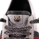 Details: Silver Glitter Fabric / Low Top Sneaker / Blue and Red Web Detail on Both Sides / Metal Tiger Face at Front / White Rubber Sole / Stud Details at Back