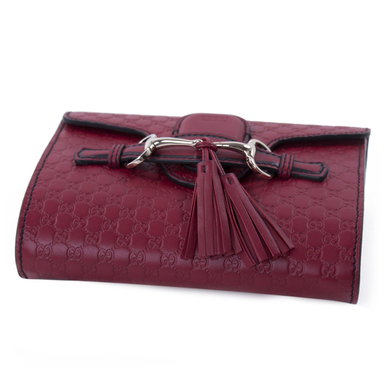 Details: Red Guccissima Leather / Gold Tone Hardware / Shoulder Strap with Chain Link Accent and Leather Pad / Natural Canvas Interior Lining / Single Slit Pocket at Interior Wall / Fold-in Flap Closure at Front / Horse-bit and Tassel Embellishments at Front