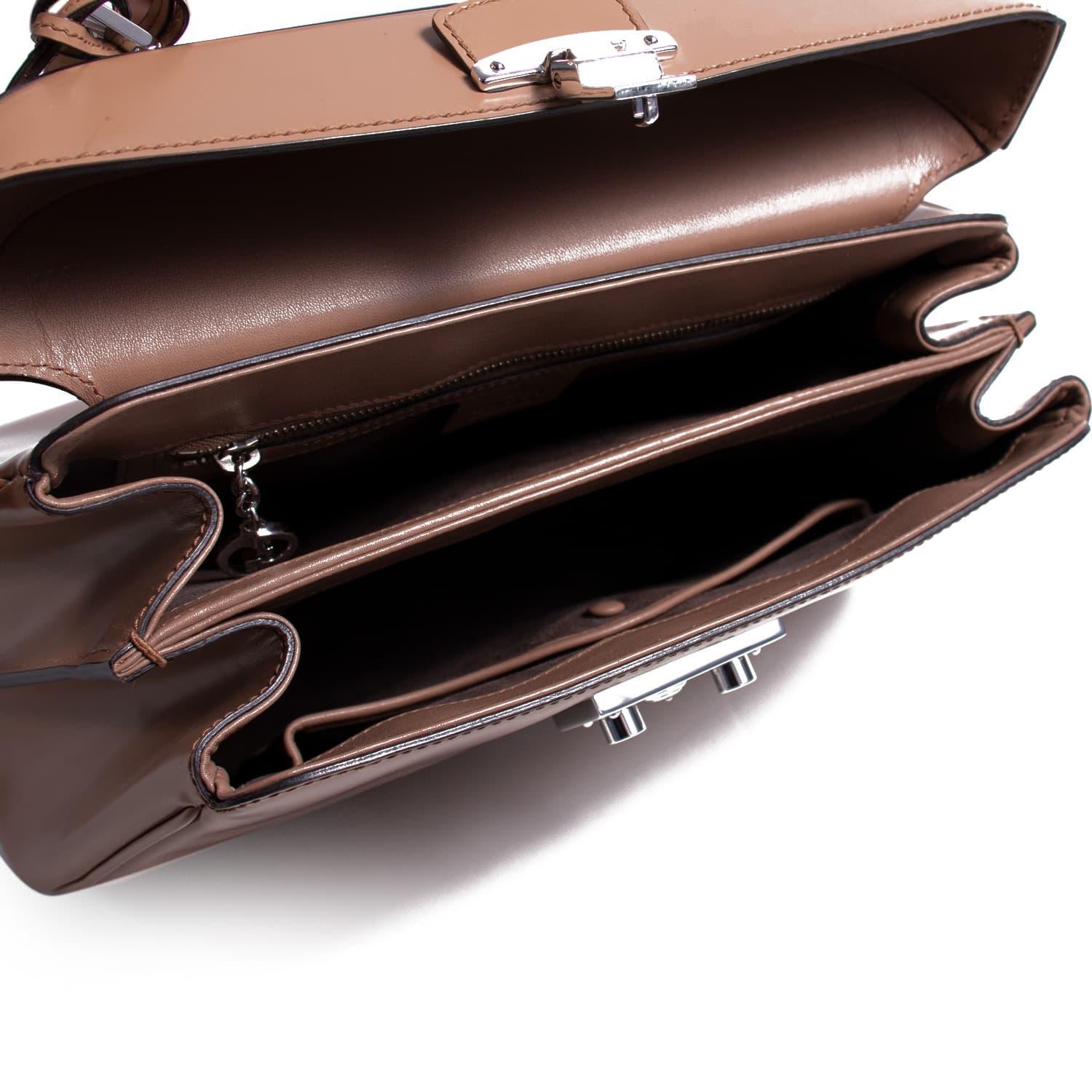 Details: Tan Soft Leather / Bamboo Wood Top Handle / Silver Tone Hardware / Grey Suede Lining / Dual Interior Compartments / Two Interior Pockets, One with Zip Closure / Flap with Push-Lock Closure