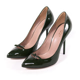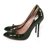 Details: Dark Green Patent Leather / Pointed Toe / Tonal Stitching / Covered Heels / Bow Embellishment At Front