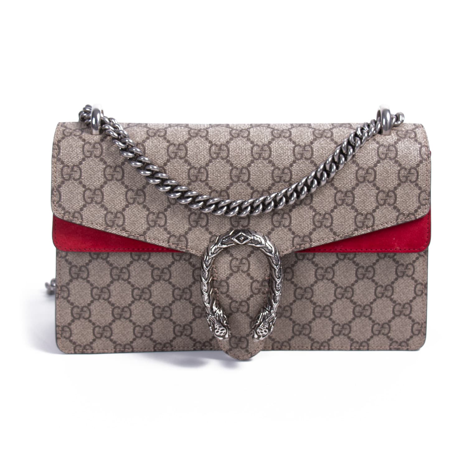 Details: Grey and Brown GG Coated Canvas / Silver-Tone Metal Hardware / Red Suede Accent / Dual Chain Link Shoulder Strap / Pocket at Front Flap Underside / Red Suede Lining / Three Compartments, One with Zip Closure / Push-Lock Closure at Front