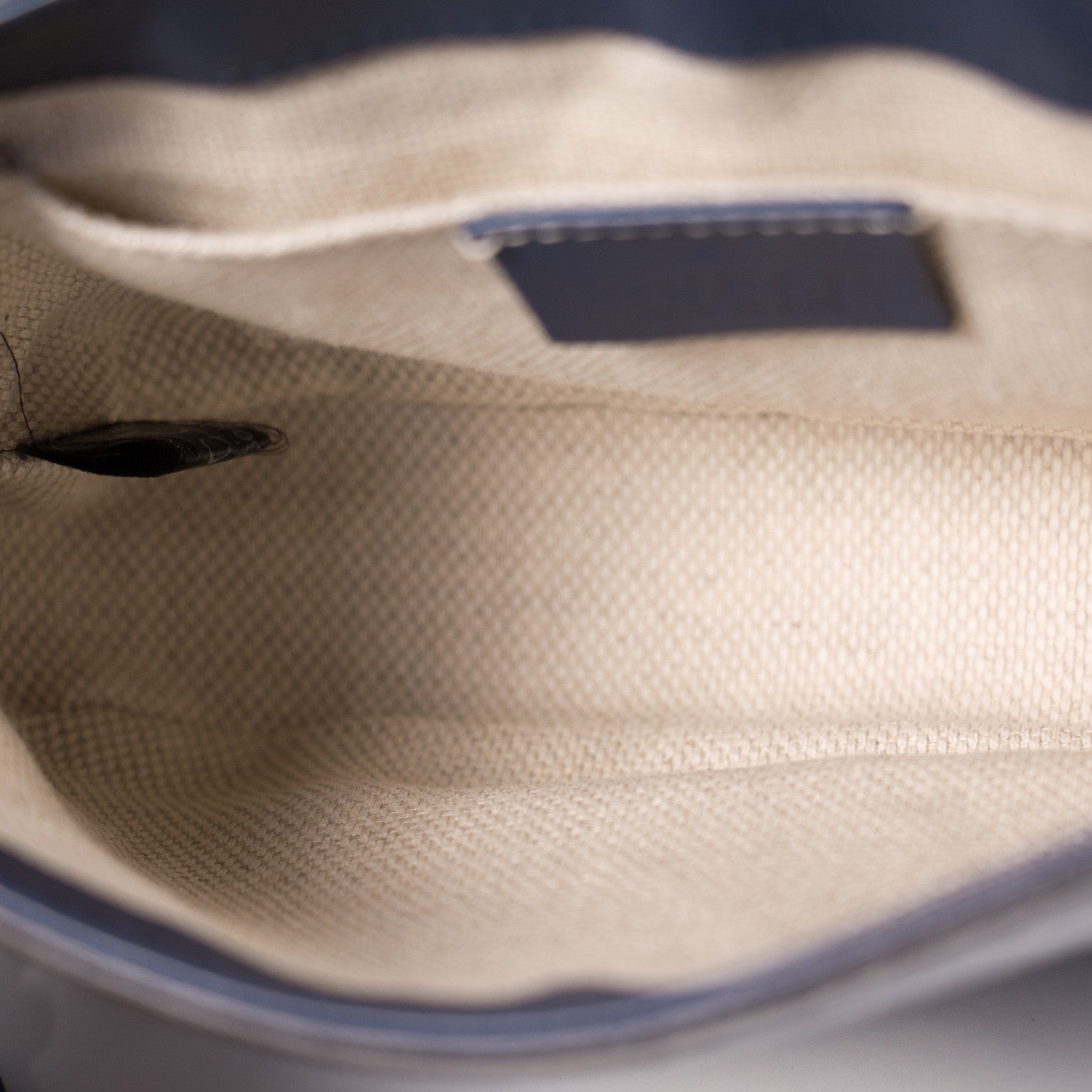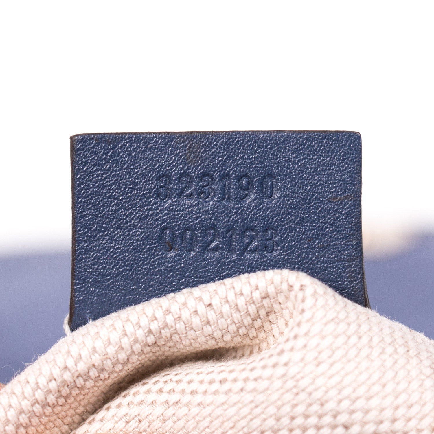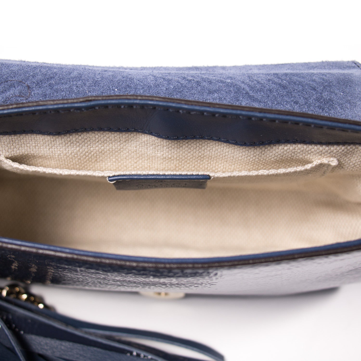 Details: Navy Blue Patent Leather / Gold-Tone Hardware / Single Shoulder Strap / Tassel Accent / Interlocking GG Logo Detail At Exterior Front / Beige Canvas Lining At Interior / Single Slit Pocket At Interior Wall / Magnetic Snap Closure At Front Flap