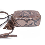 Details: Brown and Black Python Leather / Gold-Tone Hardware / Adjustable Shoulder Strap / Logo at Front / Natural Canvas at Interior / Python Tassel / Dual Slit Pockets / Zipper Closure at Top