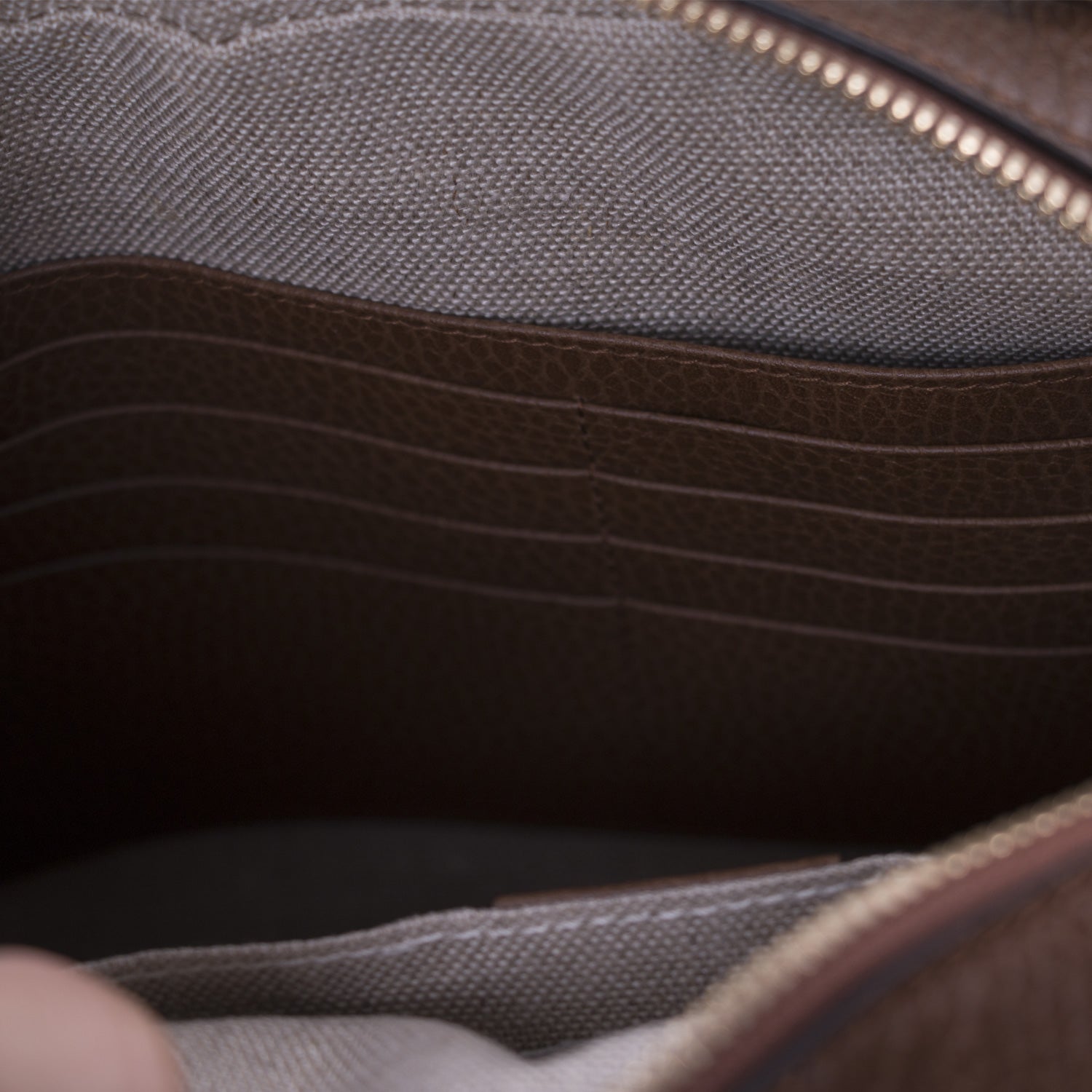 Details: Ebony and Brown GG Supreme Canvas / Gold-Tone Hardware / Brown Leather Trim / Adjustable Long Shoulder Strap / Canvas Interior Lining / Slit Pocket and 10 Card Slots / Zipper Closure at Top