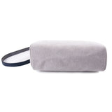 Details: Dual Interchangeable Canvas in Navy Blue and Beige / Navy Blue Leather Trim / Dual Rolled Handles / Detachable Shoulder Strap / Single Compartment with Flat Pocket / Pull-Through Closure at Front Flap