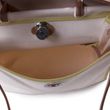 Details: Beige Toile Canvas / Palladium Hardware / Dual Rolled Handles / Removable Shoulder Strap / Lime Canvas Trim / Exterior Zip Pocket At Back / Interior Canvas Lining / Single Compartment / Extra Zip Pouch / Pull-Through Closure At Front Flap