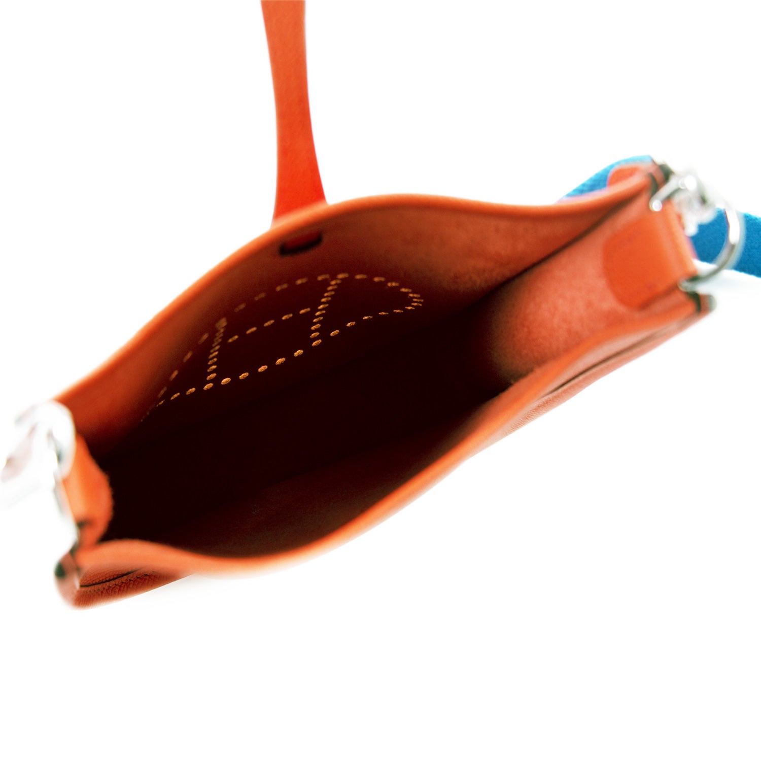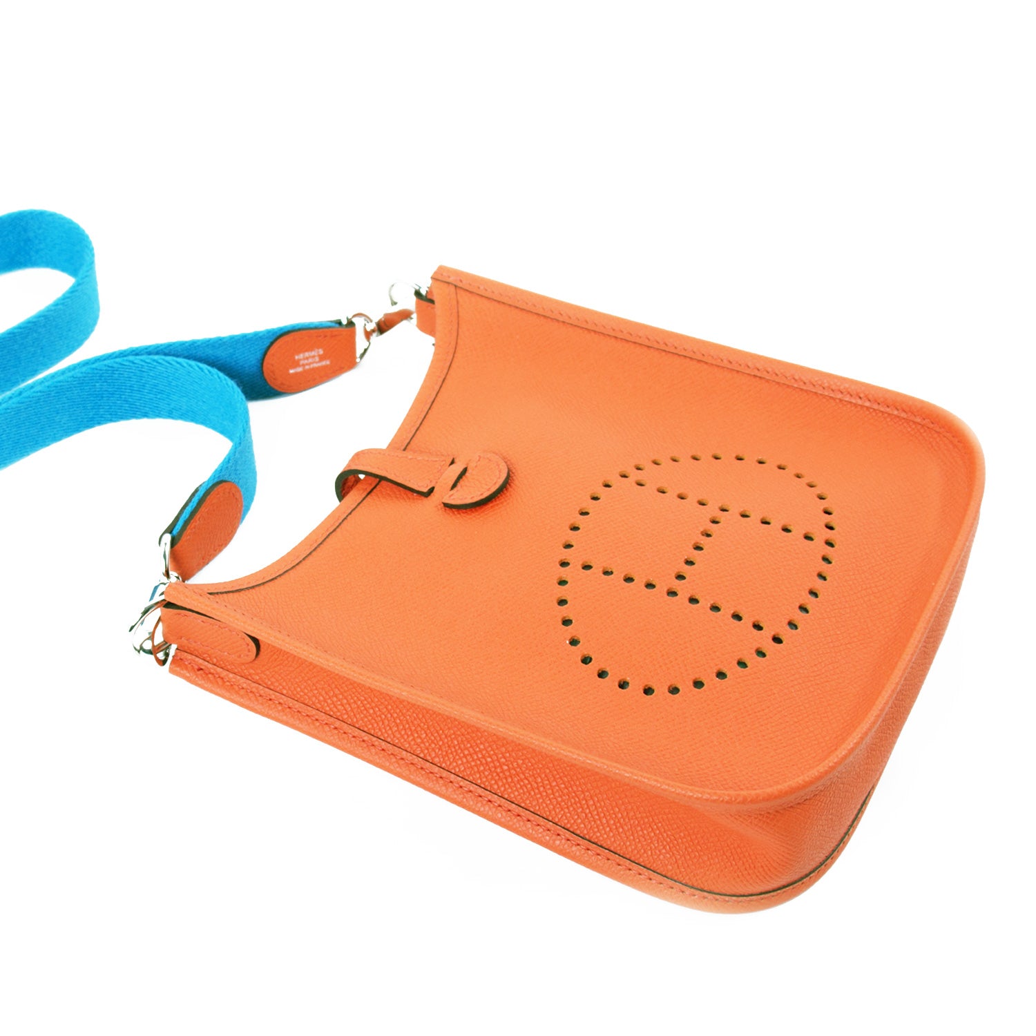 Details: Feu Orange Epsom Leather / Palladium Hardware / Bicolor Shoulder Strap (Blue Zanzibar and Orange) / Large Perforated H Icon In Circle At Front / Snap Closure at Back