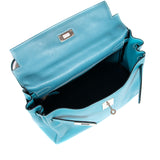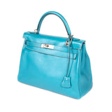 Description: Authentic Pre-Owned Hermès Kelly 32 Retourne Bleu Jean Swift Leather 2007
