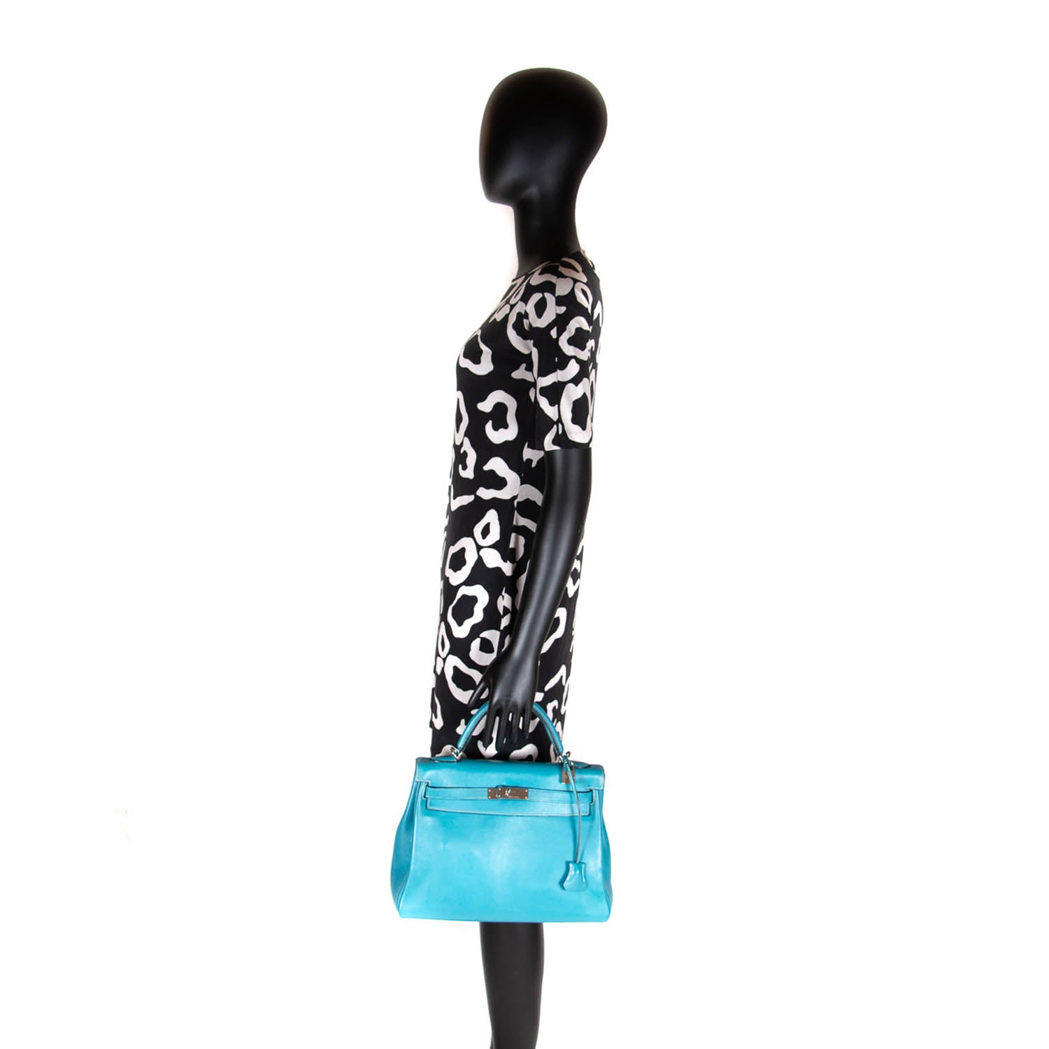 Description: Authentic Pre-Owned Hermès Kelly 32 Retourne Bleu Jean Swift Leather 2007