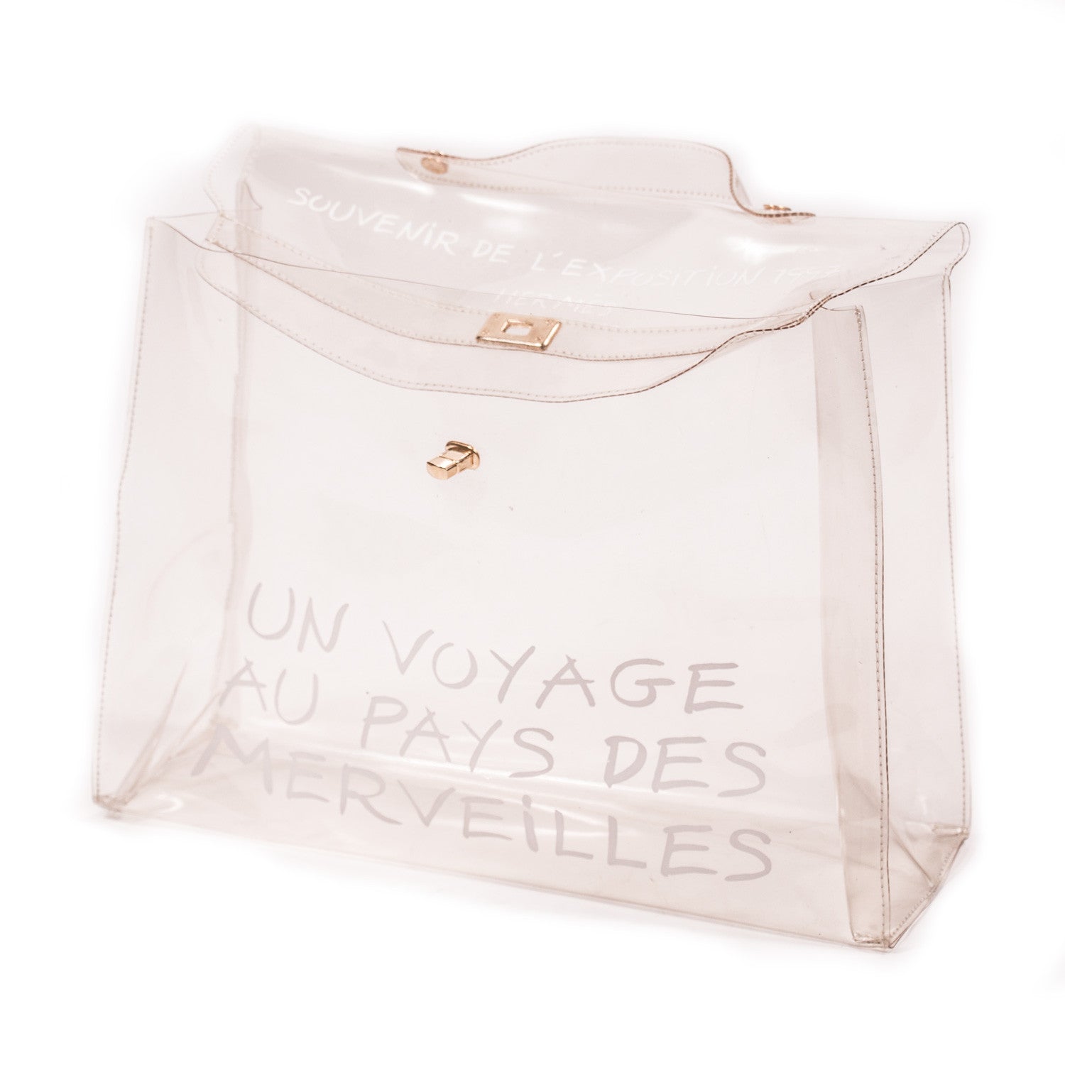 Details: Limited Edition / Transparent PVC / Gold-Tone Hardware / Single Flat Top Handle / 'Souvenir de l'Exposition 1997 Hermes' Print At Flap /'Un Voyage Au Pays Des Merveilles' Motif / Front Flap Turn Lock Closure