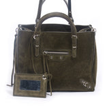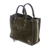Details: Vert Olive Suede Tote / Silver-Tone Hardware / Adjustable Removable Shoulder Strap / Buckled Dual Rolled Handles / Single Pocket at Exterior With Zip Closure / Stud And Buckle Embellishments at Front / Dual Zip Expansions at Sides / Vert Olive Suede Inside / Black Leather Interior Base / Single Slit Pocket at Interior Wall and Open Top