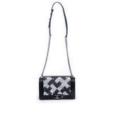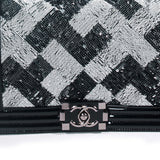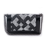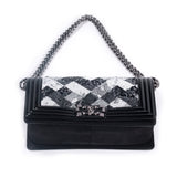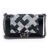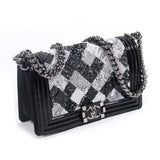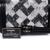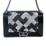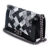 Details: Limited Edition 2015 Collection / Black Patent Calfskin Leather Chanel Medium Boy Bag / Silver Tone Hardware / Black and White Sequin Trim From Back To Front Flap / Chain Link and Black Leather Shoulder Strap / Tonal Woven Interior Lining / Interior Slip Pocket / Front Flap Interlocking CC Push Lock Closure.