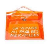 Details: Orange Vinyl / Gold-Tone Hardware / Turnlock Closure / White Screen Printed And Contrast Stitching "Un Voyage Au Pays Des Merveilles" Translation " A Trip To Wonderland" / Single Handle Drop