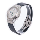 Details: Stainless Steel / White Dial / Quartz Movement: Hours Minutes Seconds Date Chronograph / Dot Hour Markers / Luminous Hands / Three Sub-dials Date Display At 6 O'clock Position / Signed Crown / Black Rubber Wrist Strap / Signed Stainless Steel Deployant Closure