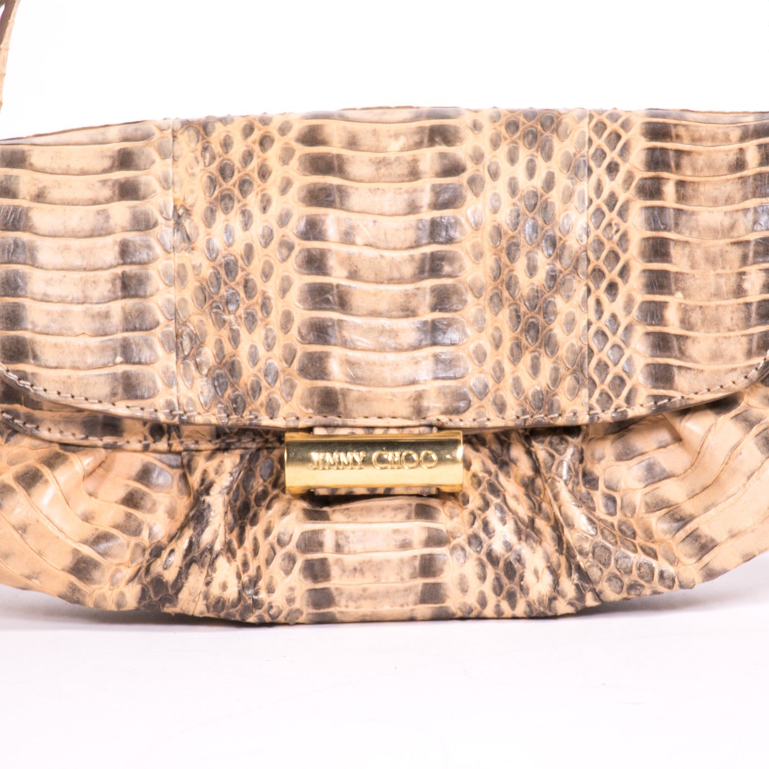 Details: Brown And Ivory / Snake Skin Covered Handbag / Gold Tone Magnetic Snap Closure At Front With Jimmy Choo Logo Engraved / Small Interior Wall Pocket / Interior Made of Leather And Satin