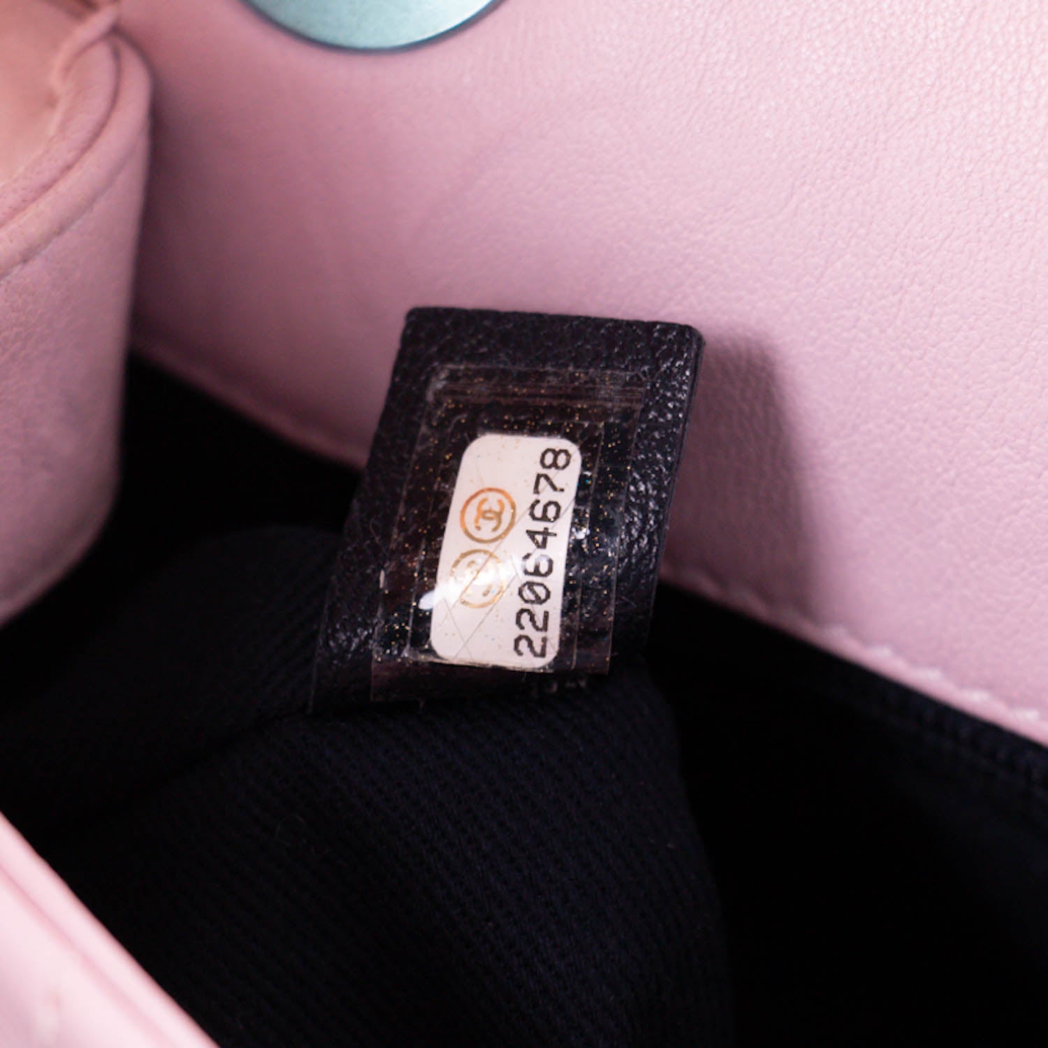 Description: Pink Chevron Quilted Leather / Gold-Tone Hardware / Chain-Link and Leather Shoulder Strap / Single Compartment / Black Fabric Lining / Single Slit Pocket at Inside / Turn-Lock Closure at Front Flap