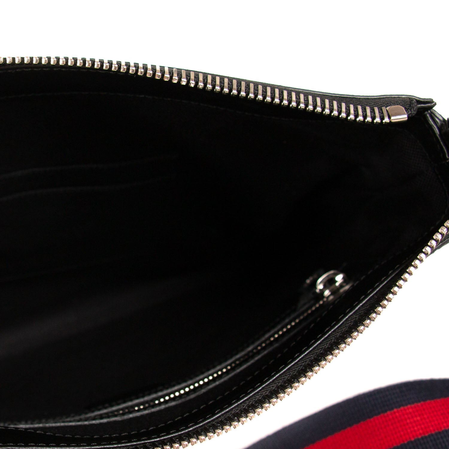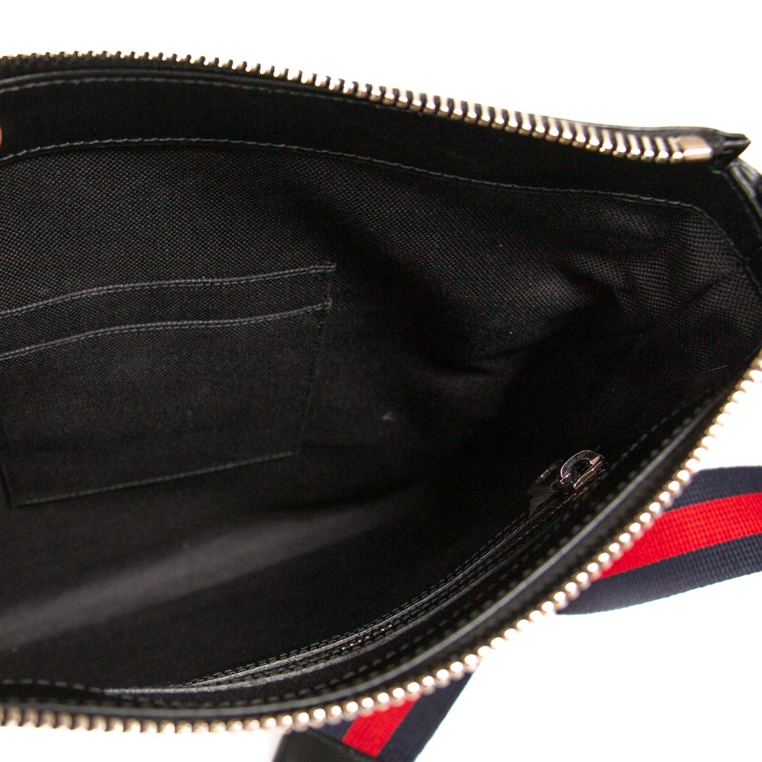 Blue and Red Web Strap with Leather Pad / Exterior Zip Pocket at Front / One Compartment with 2 Slit Pockets and Zipper Pocket / Zipper Closure