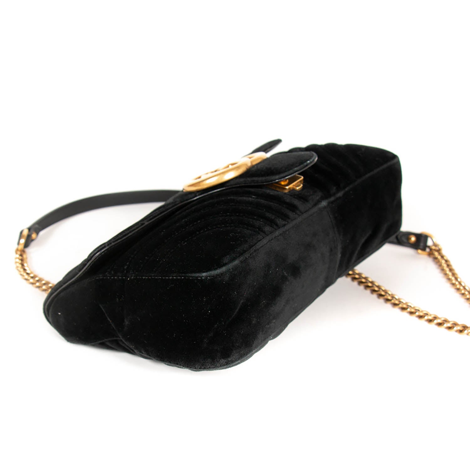 Details: Black Quilted Chevron Velvet / Gold-Tone Hardware / Chain-Link and Leather Pad Shoulder Strap / Double G Logo at Front / Satin Interior Lining / Zipper Pocket at Inside / Push Button Flap Closure at Top