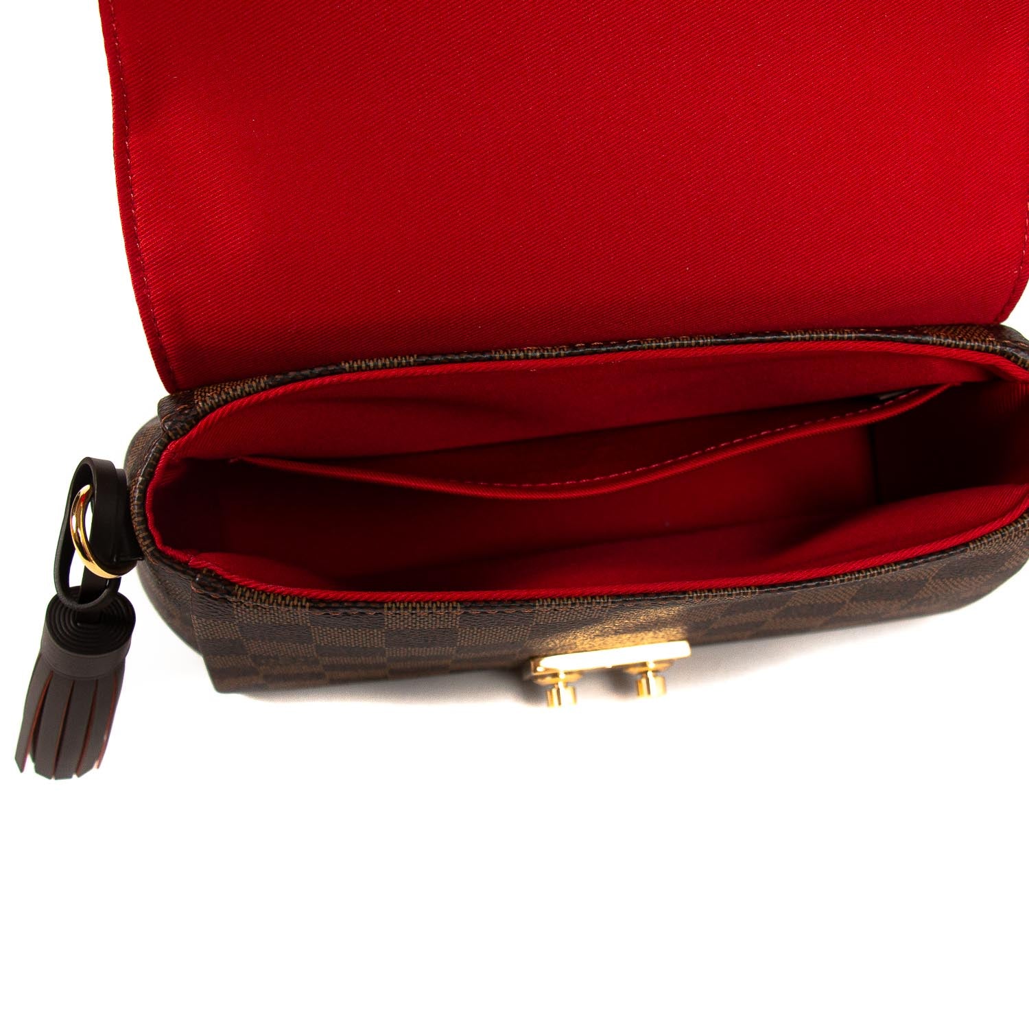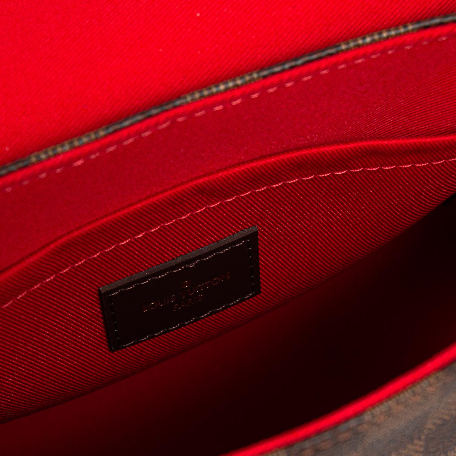 Details: Brown Damier Ebene Coated Canvas / Gold-Tone Hardware / Single Rolled Handles / Detachable Shoulder Strap / Red Fabric Lining / Interior Slit Pocket / S-Lock Closure at Front Flap