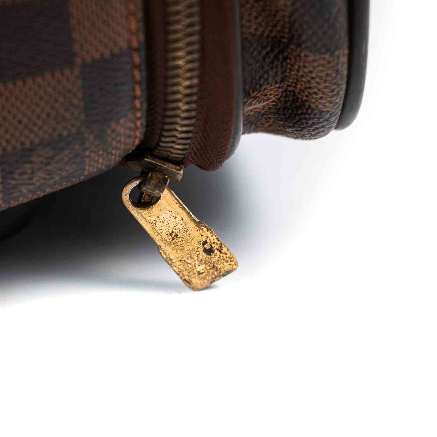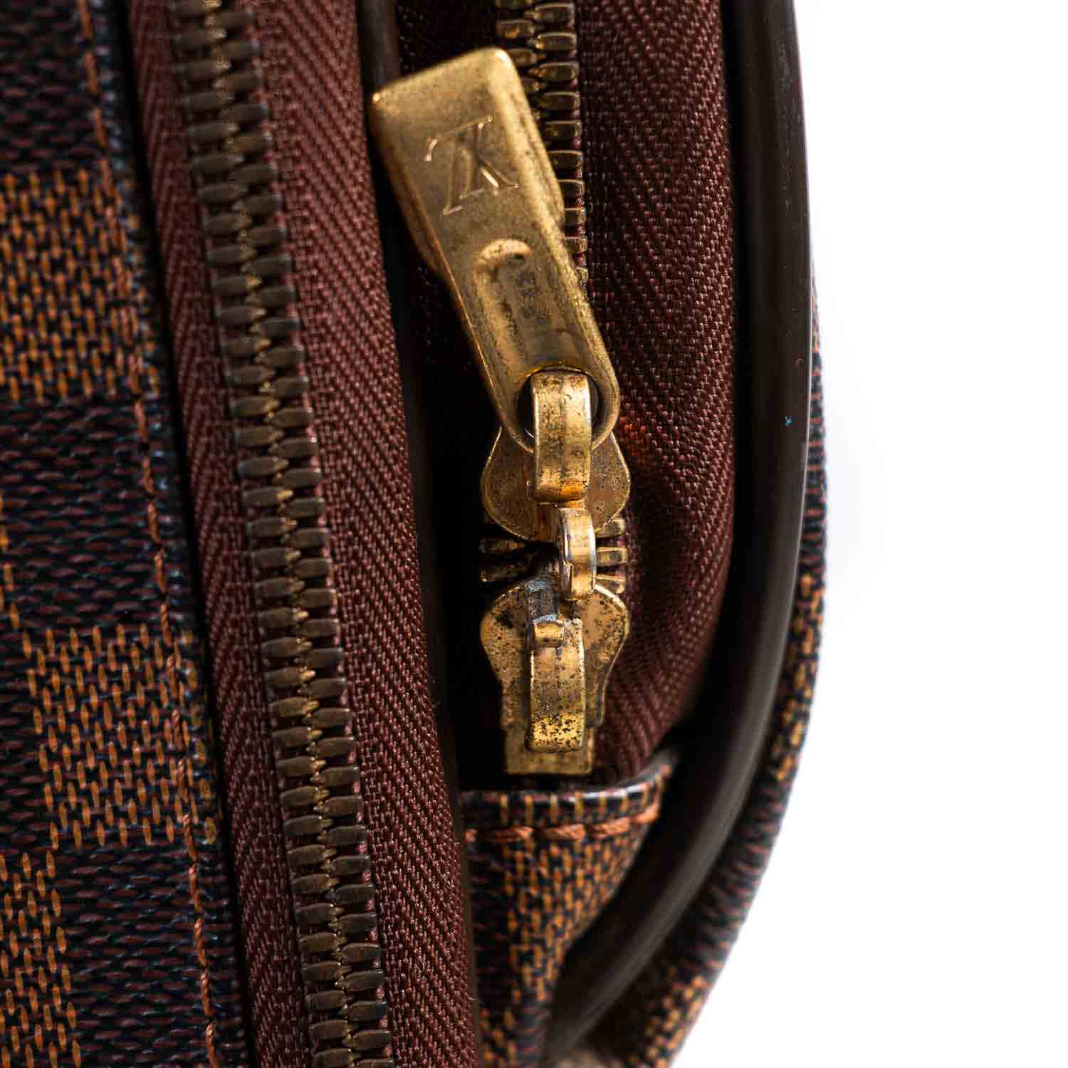 Details: Brown Damier Ebene Coated Canvas / Brass Hardware / Brown Leather Trim / Top Handle / Side Handle / 3 Front Zip Pockets / Double Zip Closure / Brown Interior Lining / Dual Interior Zipped Pockets / Interior Compartment with Dual Flaps