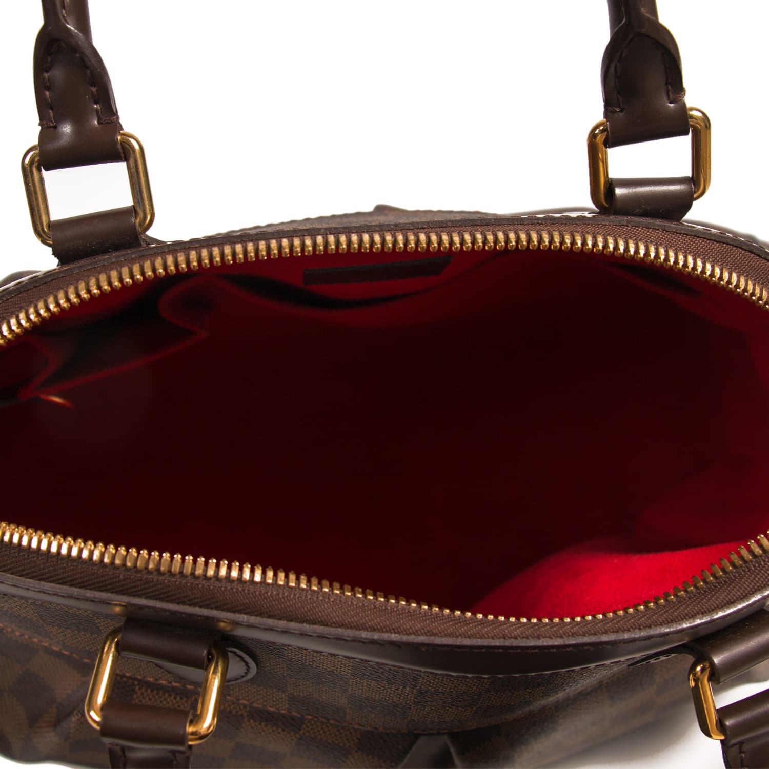 Details: Brown Damier Ebene Canvas / Gold-Tone Hardware / Brown Leather Trim / Dual Rolled Handles / Detachable Adjustable Shoulder Strap / Red Alacantra Interior Lining / Dual Slit Pockets at Interior / Zip Closure