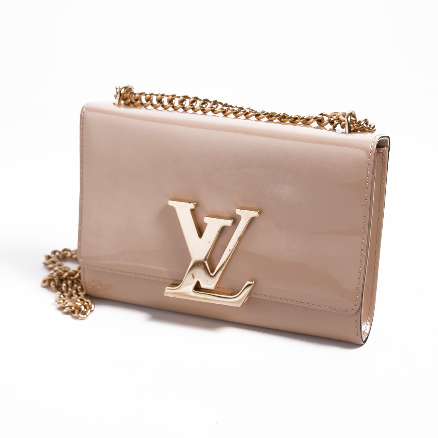 Details: Nude Vernis Leather / Gold-Tone Hardware / Dual-Way Chain / Logo at Front / Fabric Interior Lining / One Compartment / Dual Flat Pocket and Zipper Pocket at Inside / Flip Lock Closure at Front