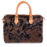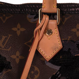 Details: Brown Monogram Coated Canvas / Grey Silkscreen with Black Floral Sequin and Velvet Flocking Throughout the Exterior / Gold-Tone Hardware / Black Leather Trim / Dual Rolled Handles / Brown Fabric Lining / Slit Pocket at Inside / Zip Closure at Top