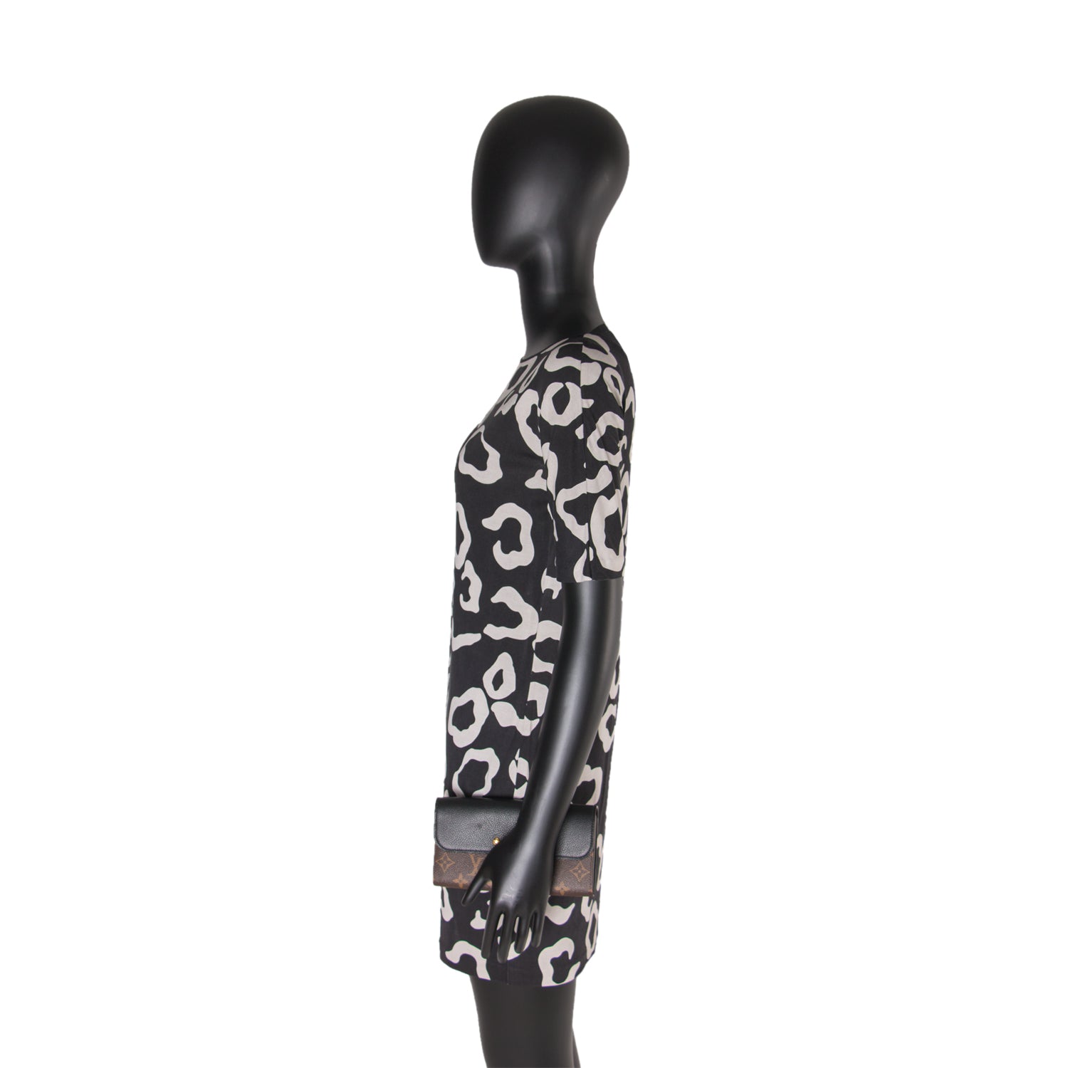 Details: Monogram Coated Canvas and Grained Black Leather / Gold-Tone Hardware / Exterior Pocket at Back / Three Compartments, One with Zipper Closure / 1-Bill Compartment / 16-Card Slot / Push Button Closure at Front Flap