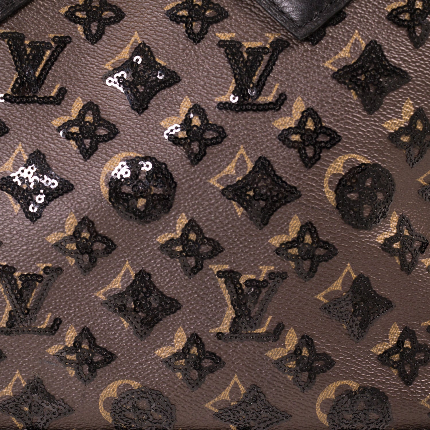 Details: Monogram Coate Canvas with Black Sequin / Gold-Tone and Silver Hardware / Dual Leather Shoulder Strap / Black Leather Accent / Black Toile Canvas Lining / Slit Pocket at Interior / Dual Zip Closure at Top / Protective Studs at Base