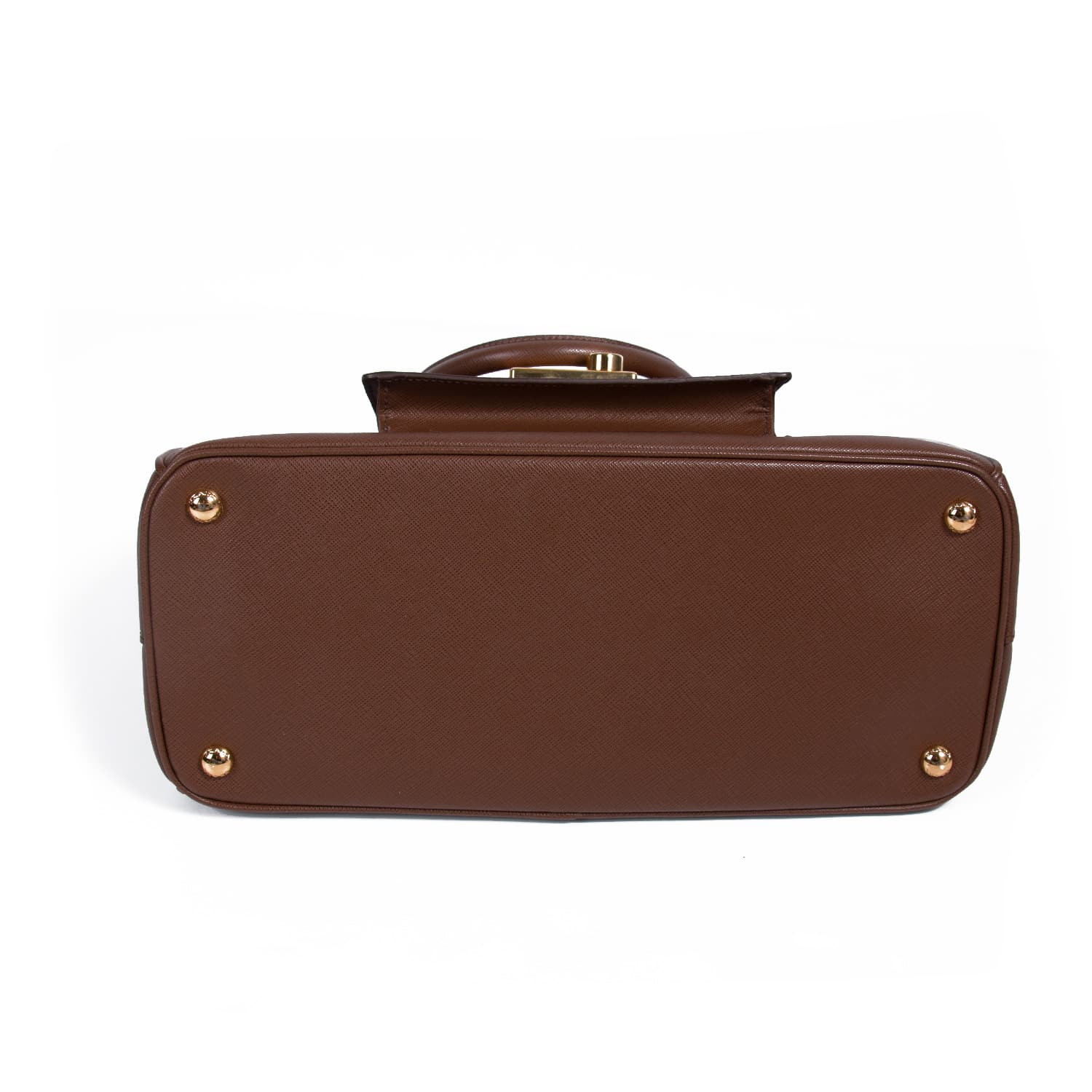 Details: Brown Saffiano Leather / Gold Tone Hardware / Dual Rolled Handles / Adjustable and Removable Shoulder Strap / Dual Zipper Exterior Pocket / Exterior Small Pocket at Front  / One Zip Pocket and Three Slit Pocket at Interior