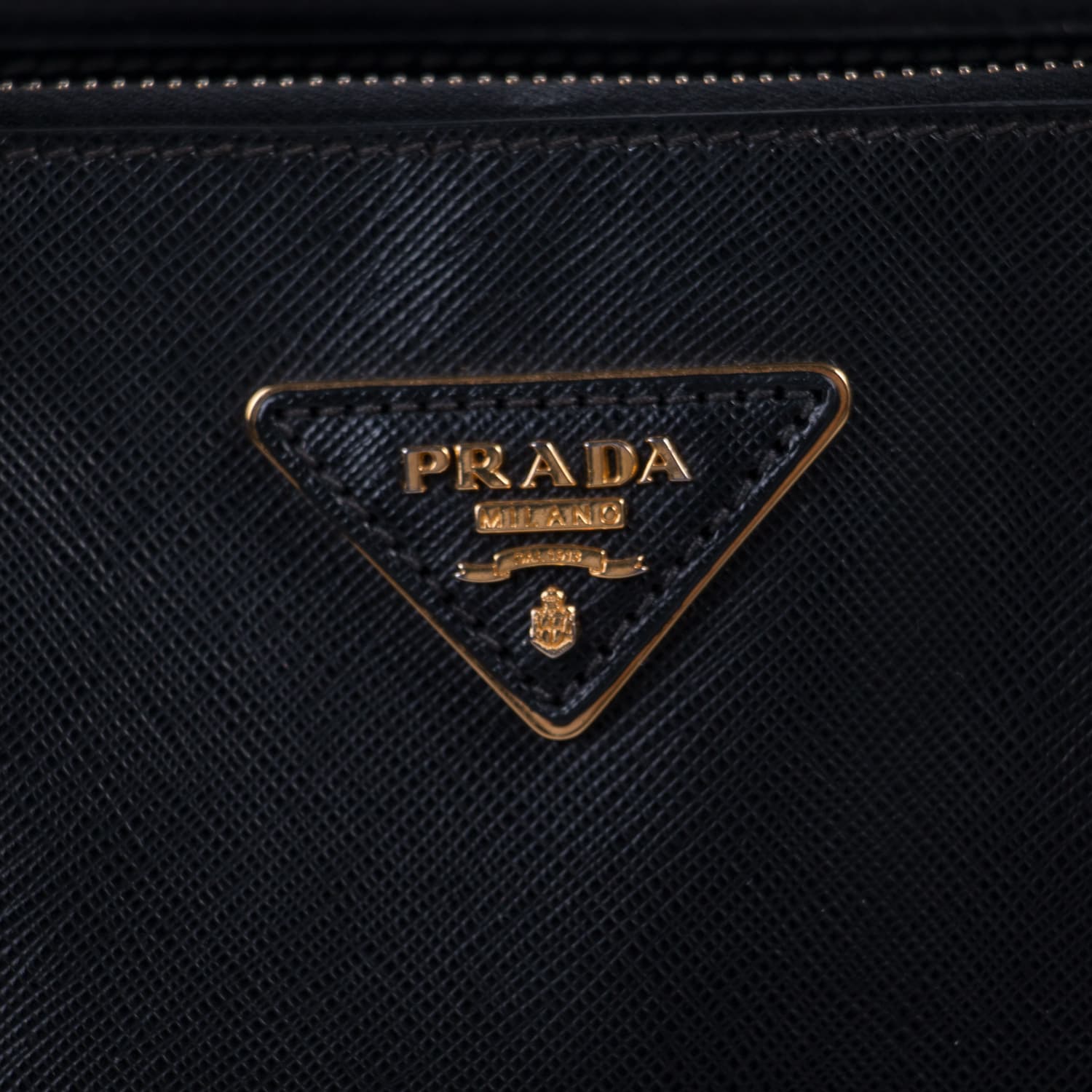 Details: Black Saffiano Leather / Gold-Tone Hardware / Dual Rolled Handles / Black Fabric Lining / Three Compartments, Two with Zip Closure / Four Pockets at Interior, One with Zip Closure.