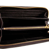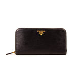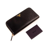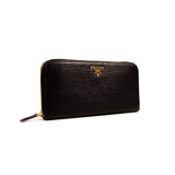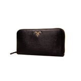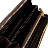 Details: Black Saffiano Leather / Gold-Tone Hardware / Logo at Front / Black Leather Lining / Three Compartments / Zip Pocket / 3 Bill Compartment / 12 Card Slots / Zipper Closure Around