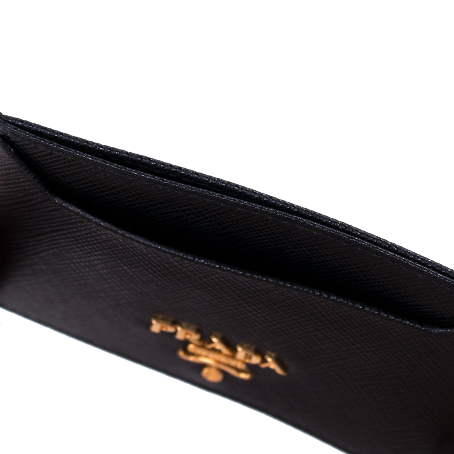Details: Black Saffiano Leather / Gold-Tone Hardware / Logo at Front / Two-Card Compartment / Centre Slot Compartment