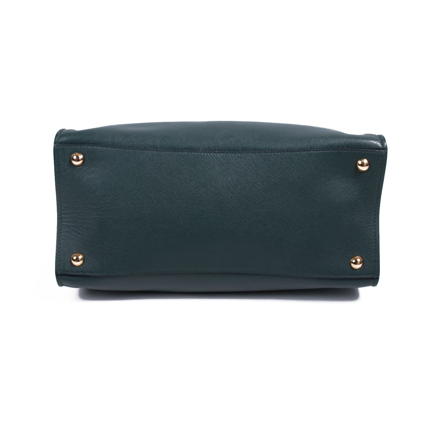 Details: Dark Green Saffiano Leather / Gold-Tone Hardware / Dual Rolled Handles / Detachable Adjustable Shoulder Strap / Protective Studs at Base / Five Compartments, Two with Magnet Closure and One with Zipper / Three Slit Pockets and Two Zip Pockets / Open Top