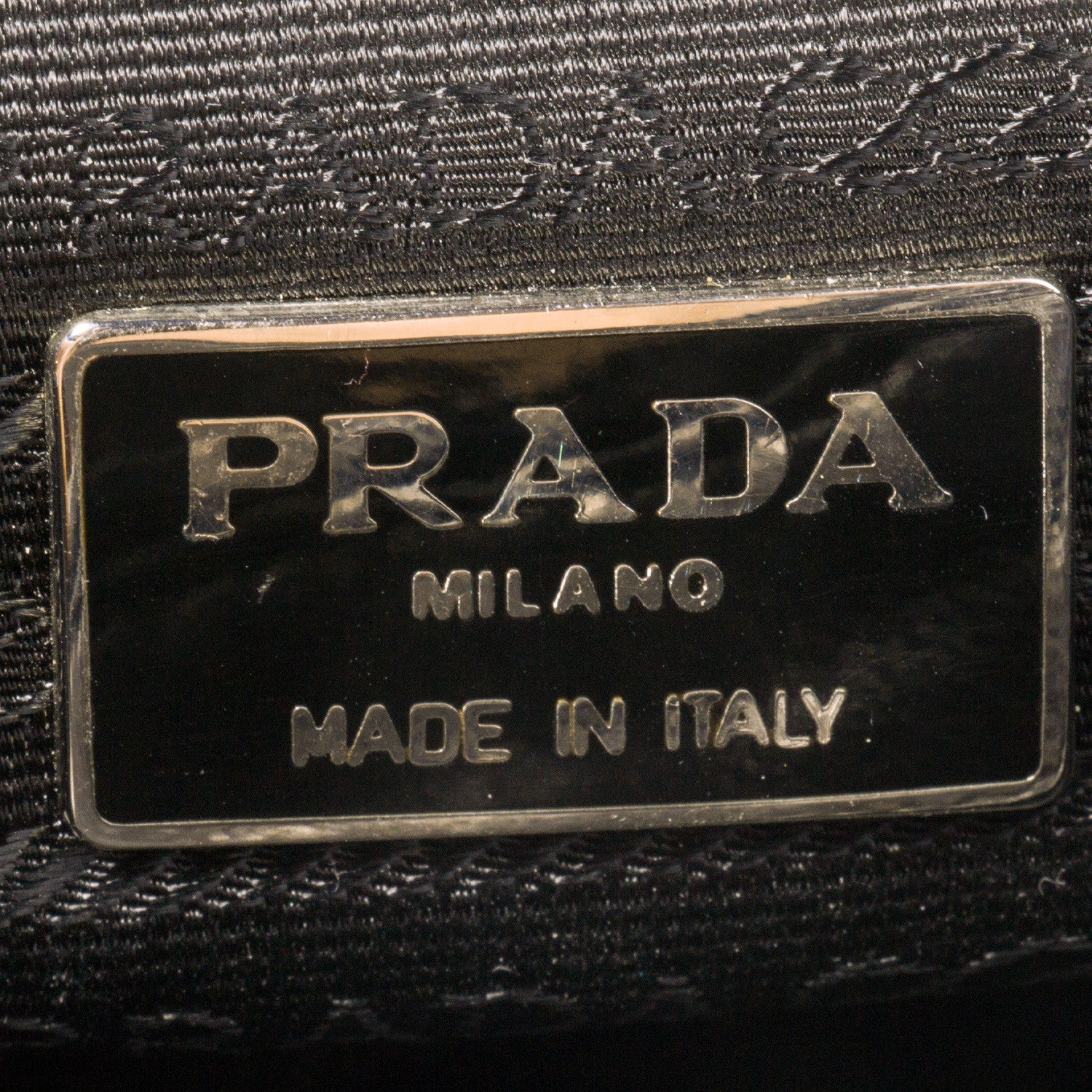 Details: Black Prada Tote / Silver Tone Hardware / Tonal Stitching / Logo At Front / Dual Rolled Top Handles / Black Logo Print Woven Lining / Three Compartment, One / Zipper Pocket At Interior Wall