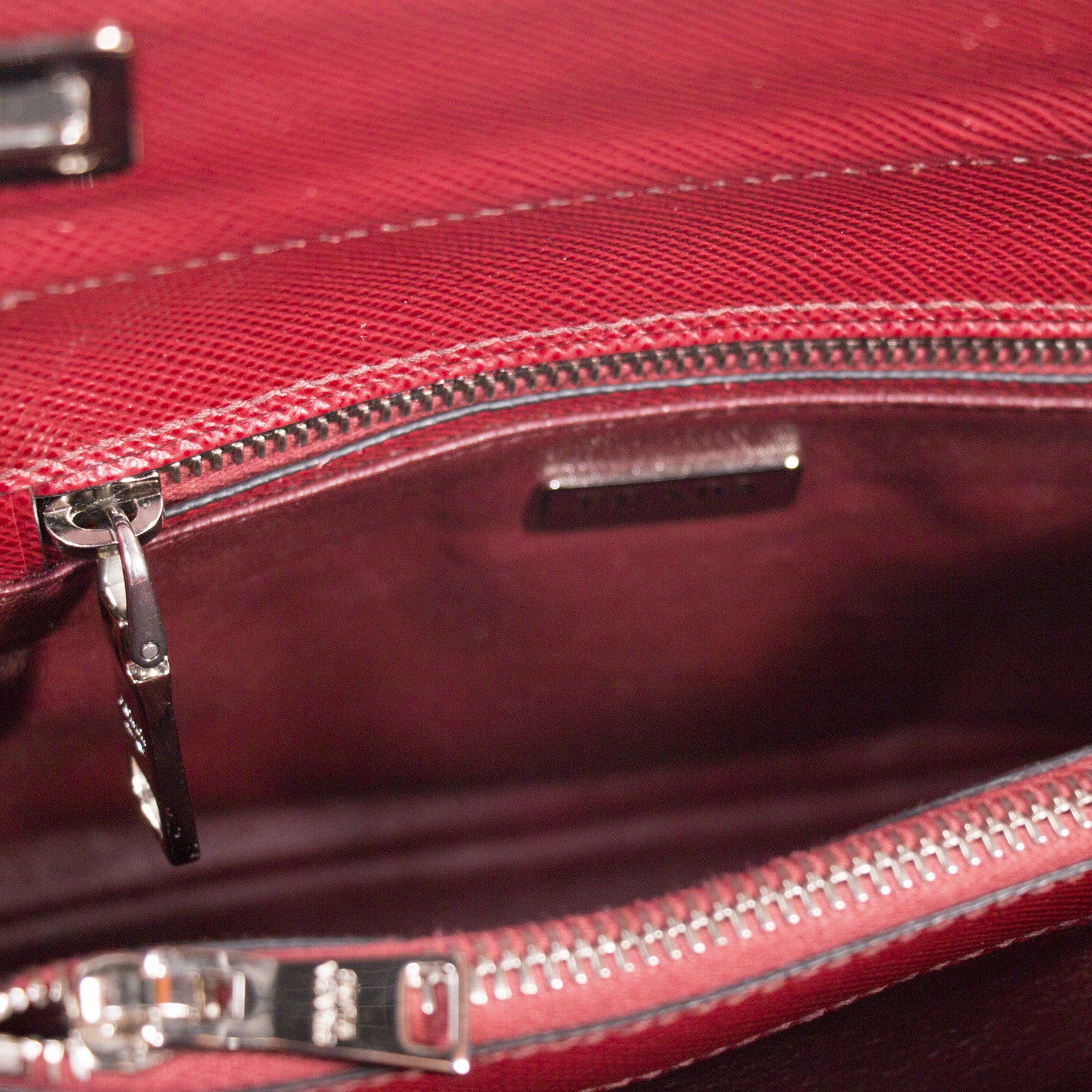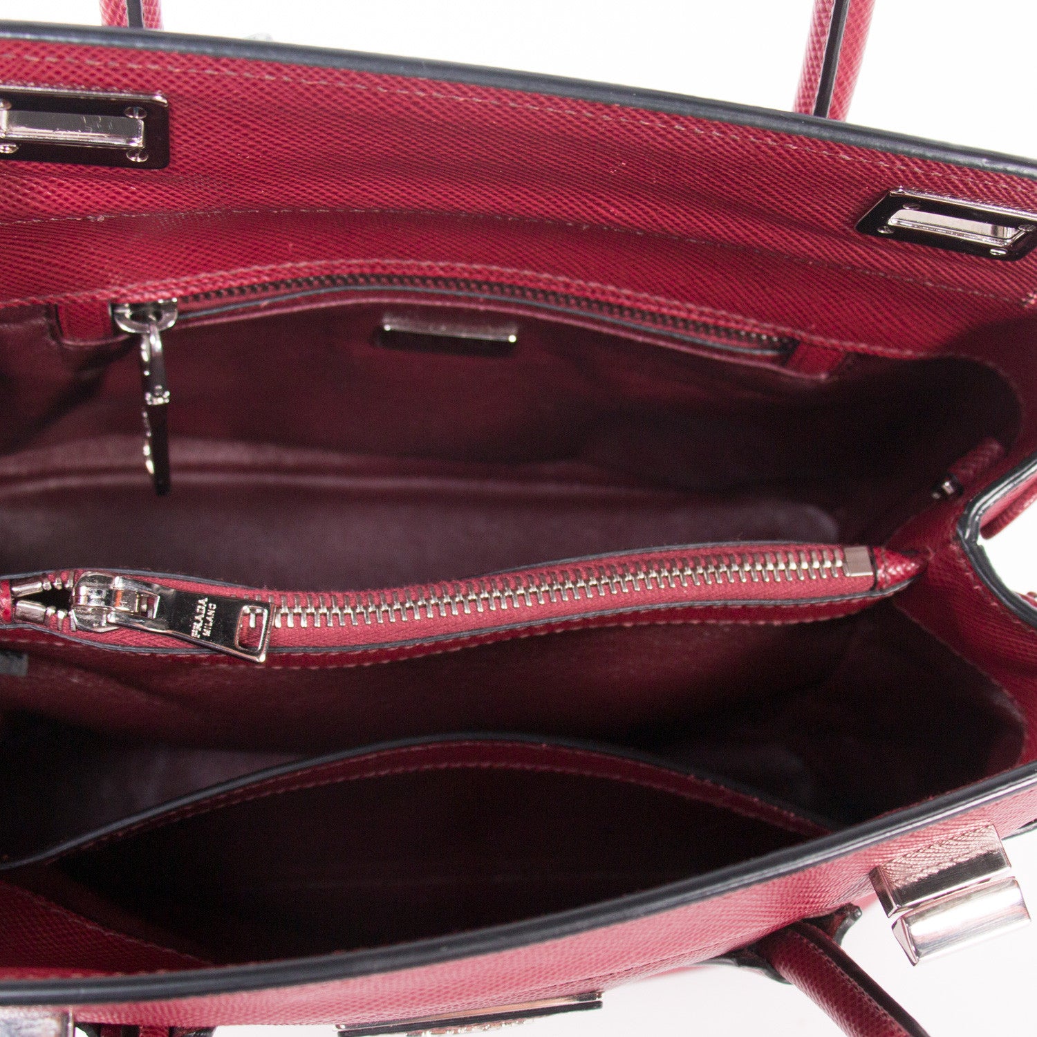 Details: Burgundy Saffiano Cuir Leather / Silver-Tone Hardware / Dual Rolled Handles / Adjustable Detachable Shoulder Strap / Marron Leather Lining / Three Compartments, One With Zip Closure / Zip Pocket And Slit Pocket At Interior / Dual Turn Lock Closure At Top / Protective Studs At Base