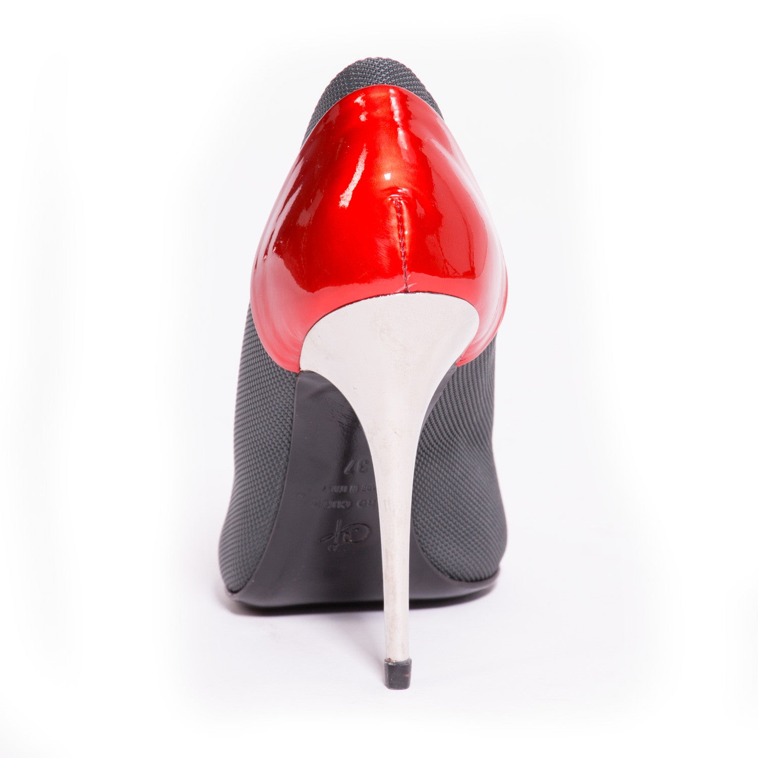 Details: Woven Nylon Pumps With Matt Beige Cap-Toes / Emerald Red Patent Leather Counters and Reflective Heels / Sophisticated Color and Mixed textures / Woven Grey Fabric / Metallic Red Patent Heel Counter / Mirrored Stiletto heel / Leather insole and Sole
