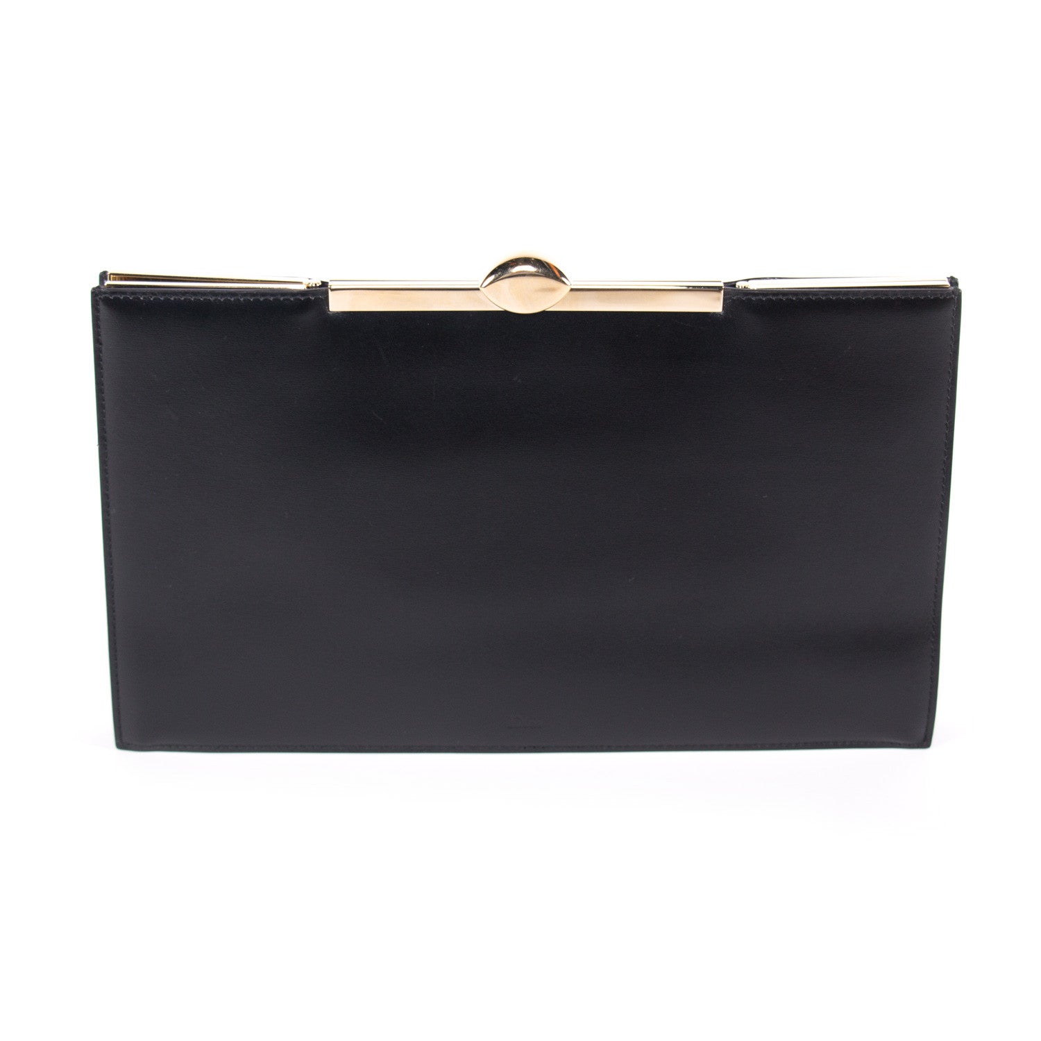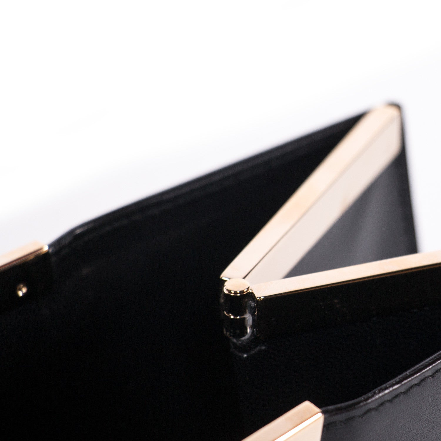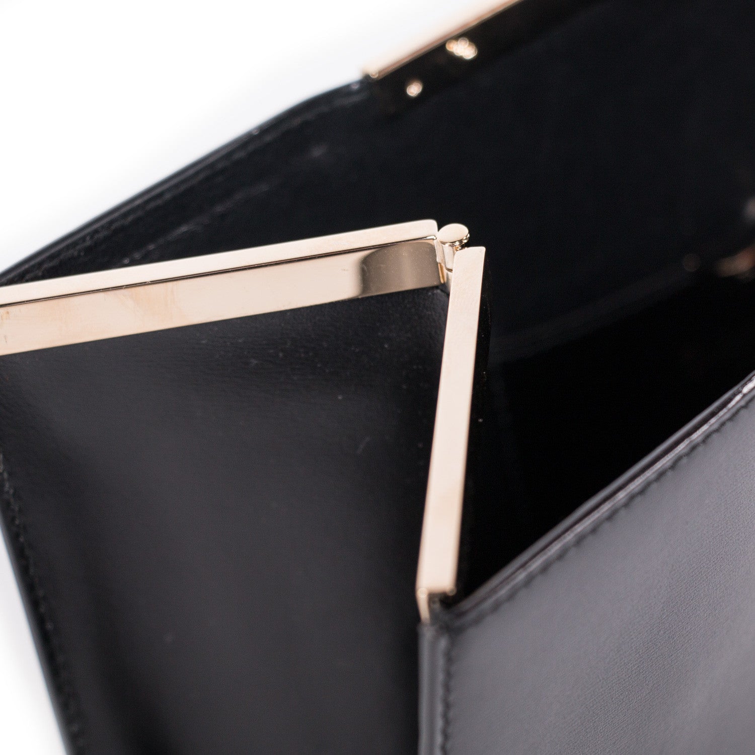 Details: Black Smooth Calfskin Leather / Gold-Tone Hardware / Rectangular Box Shape / Metal Top / Black Leather Lining At Interior / Single Compartment / Single Slit Pocket / Push Lock Closure At Top