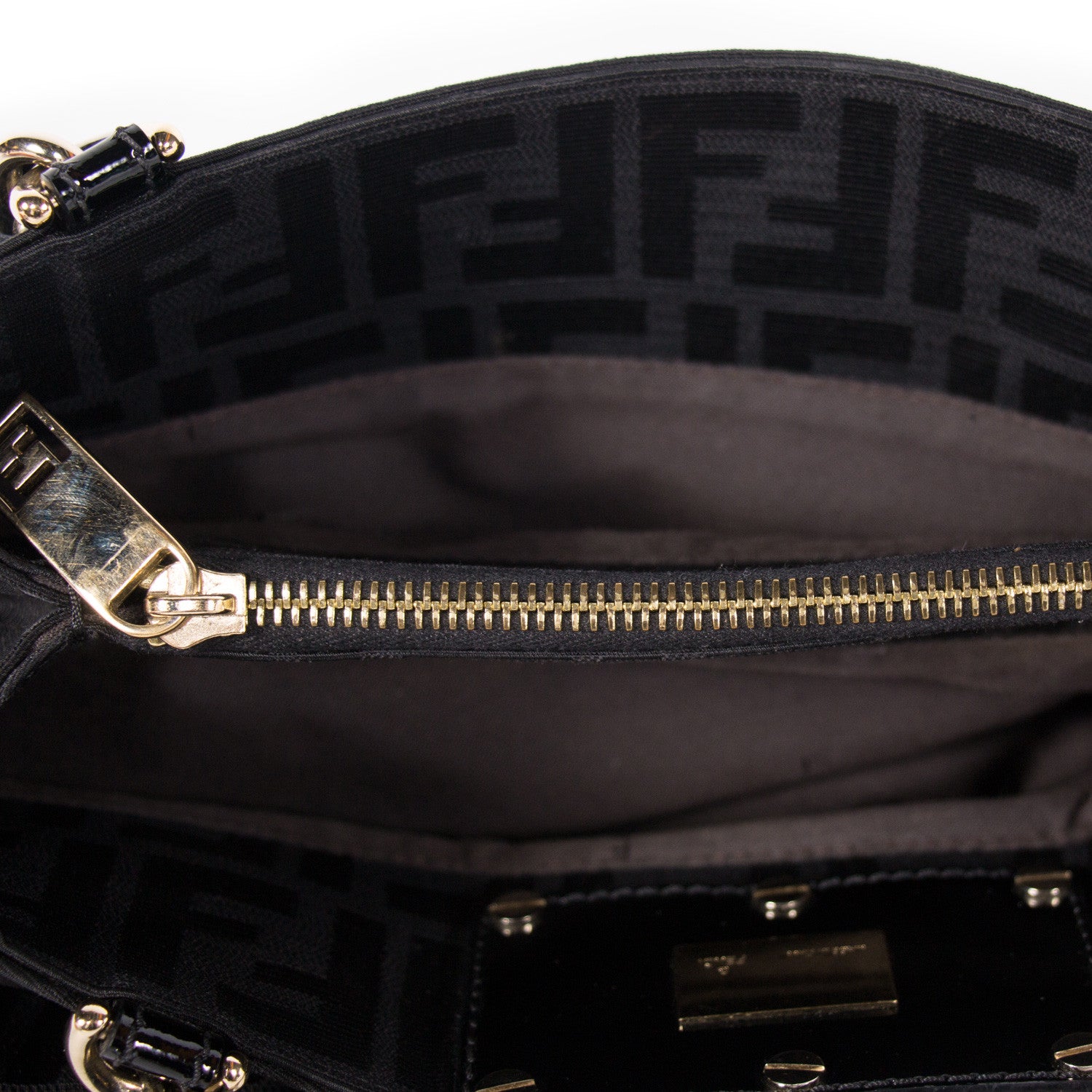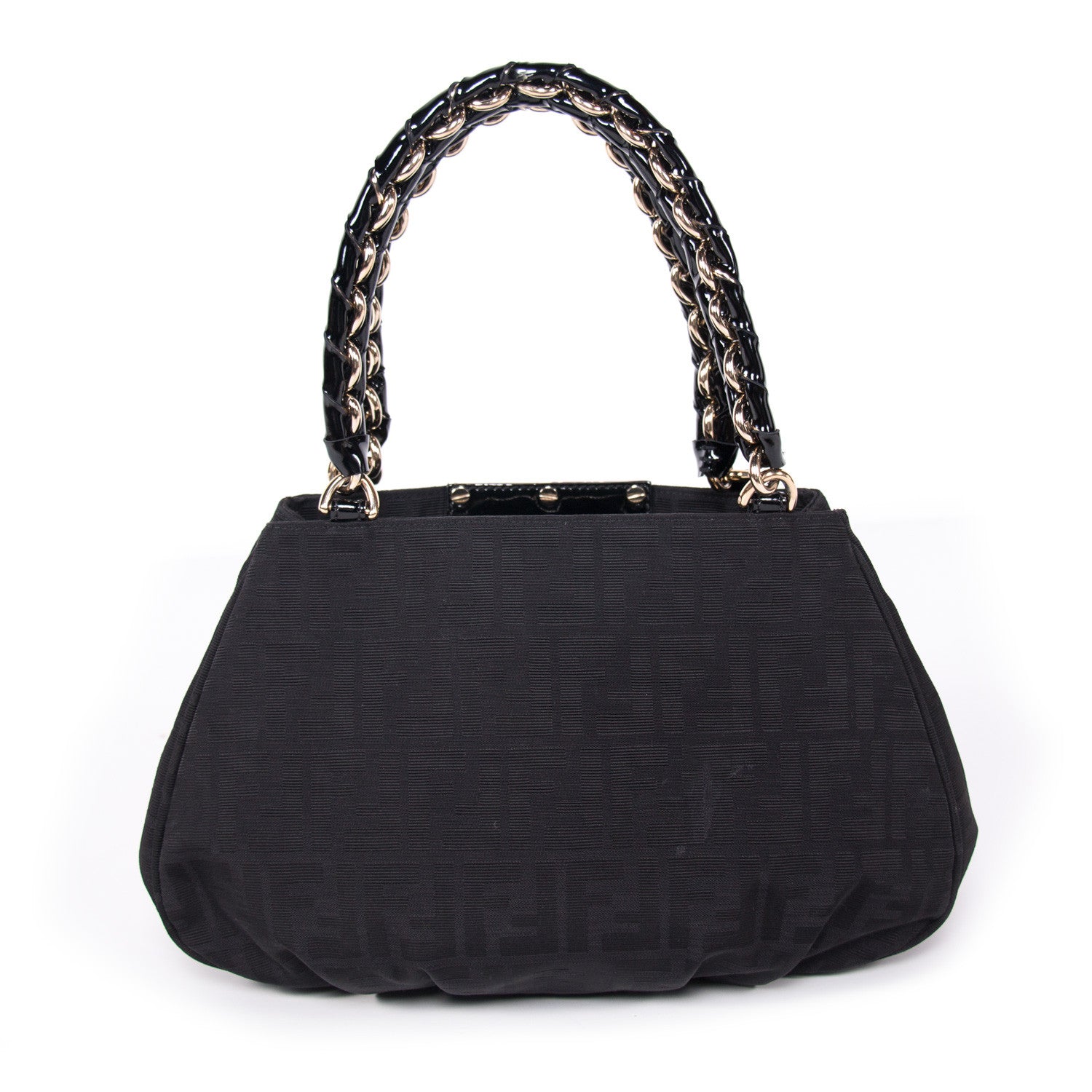 Details: Black Zucca Canvas / Gold-Tone Hardware / Dual Rolled Handles Featuring Chain-Link And Black Patent Leather / Double F Metal Plate At Front Face / Two Large Compartments Featuring Zip Pocket At Center / Slit Pocket At Interior Wall