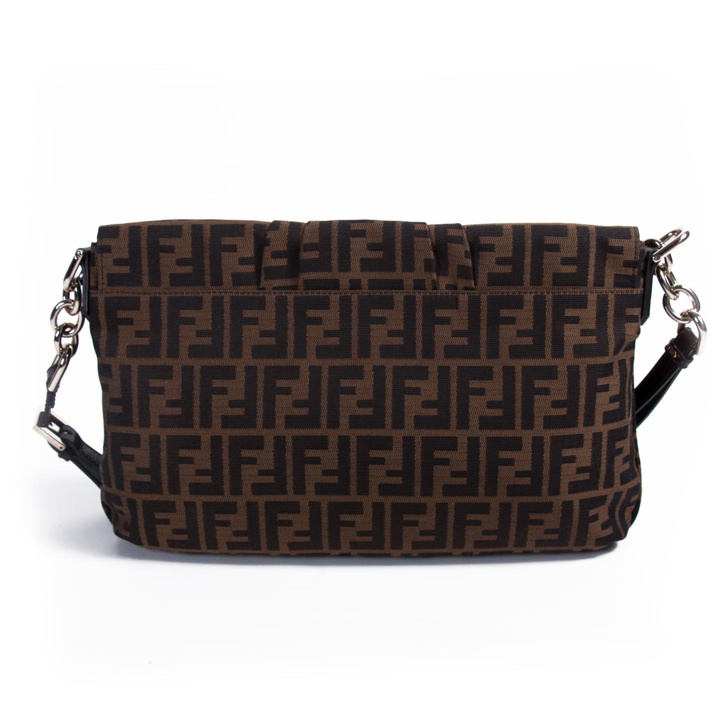 Details: Brown and Tobacco Zucca Print Canvas / Gold-Tone Hardware / Brown Leather Long Adjustable Shoulder Strap / Metal Plate Logo on the Front / Dark Grey Fabric Lining / Zipper Pocket at Inside / Magnetic Snap Closure at Front Flap