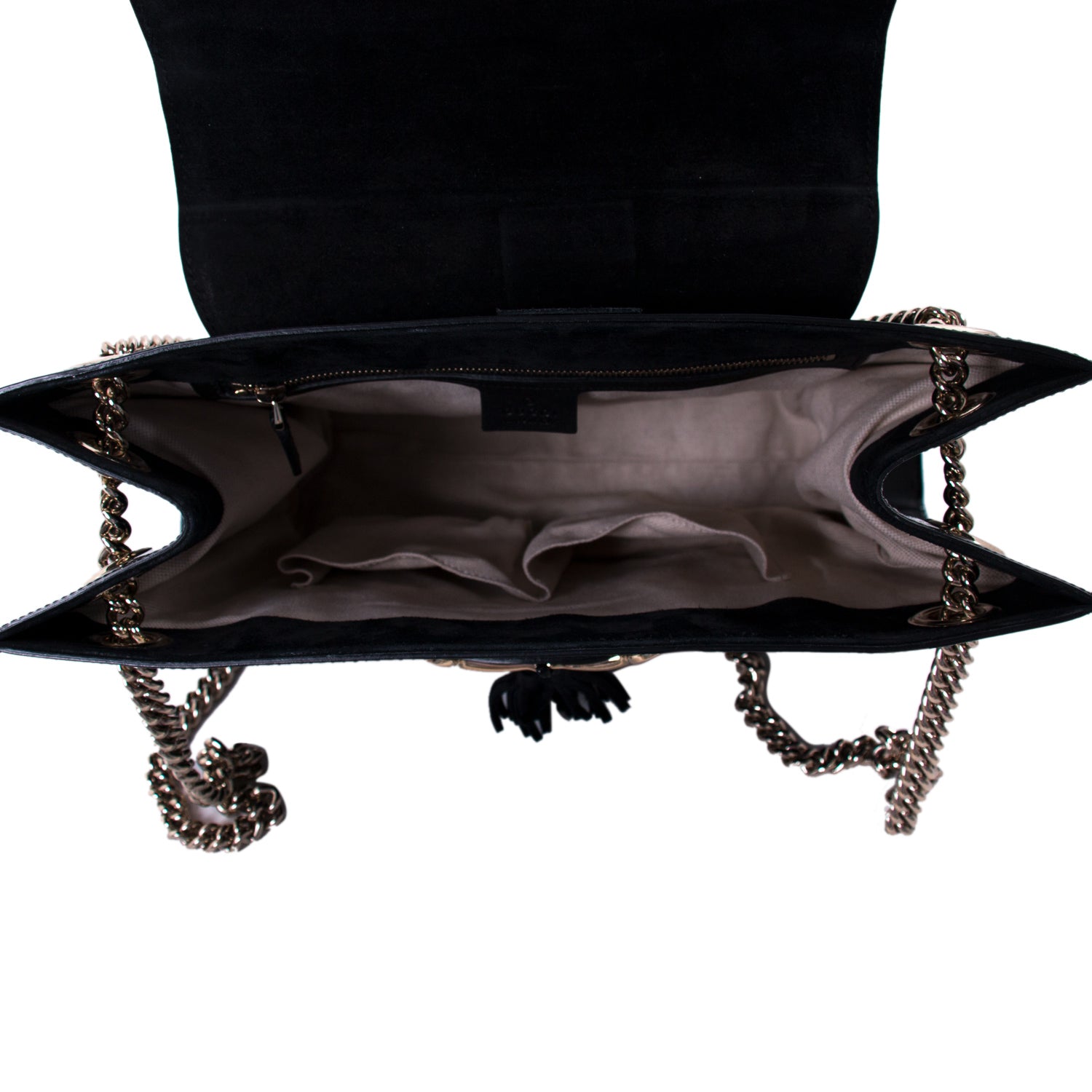 Details: Black Patent Leather / Gold-Tone Hardware / Dual Chain-Link Shoulder Strap / Tassel Adornment at Front / Natual Fabric Interior Lining with Black Suede Trim / Three Pockets, One with Zipper / Flap Closure at Top