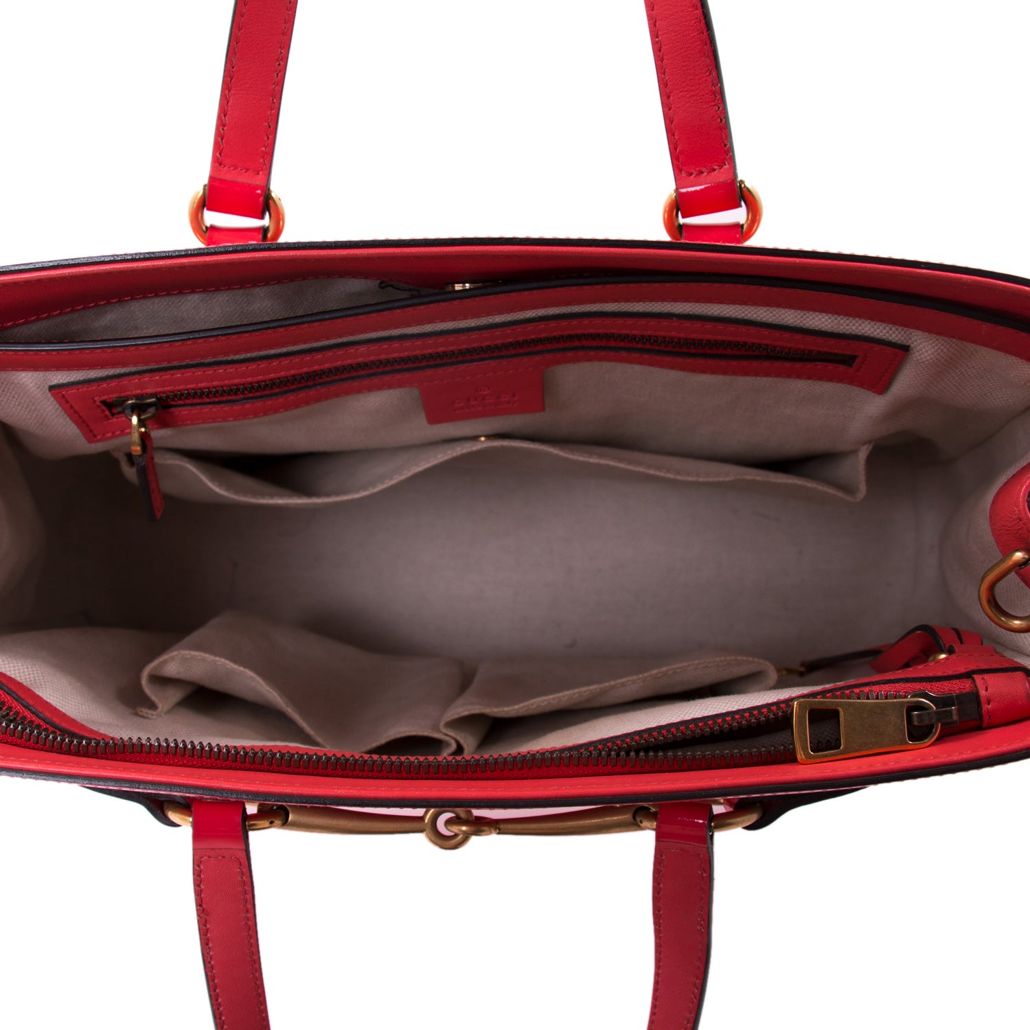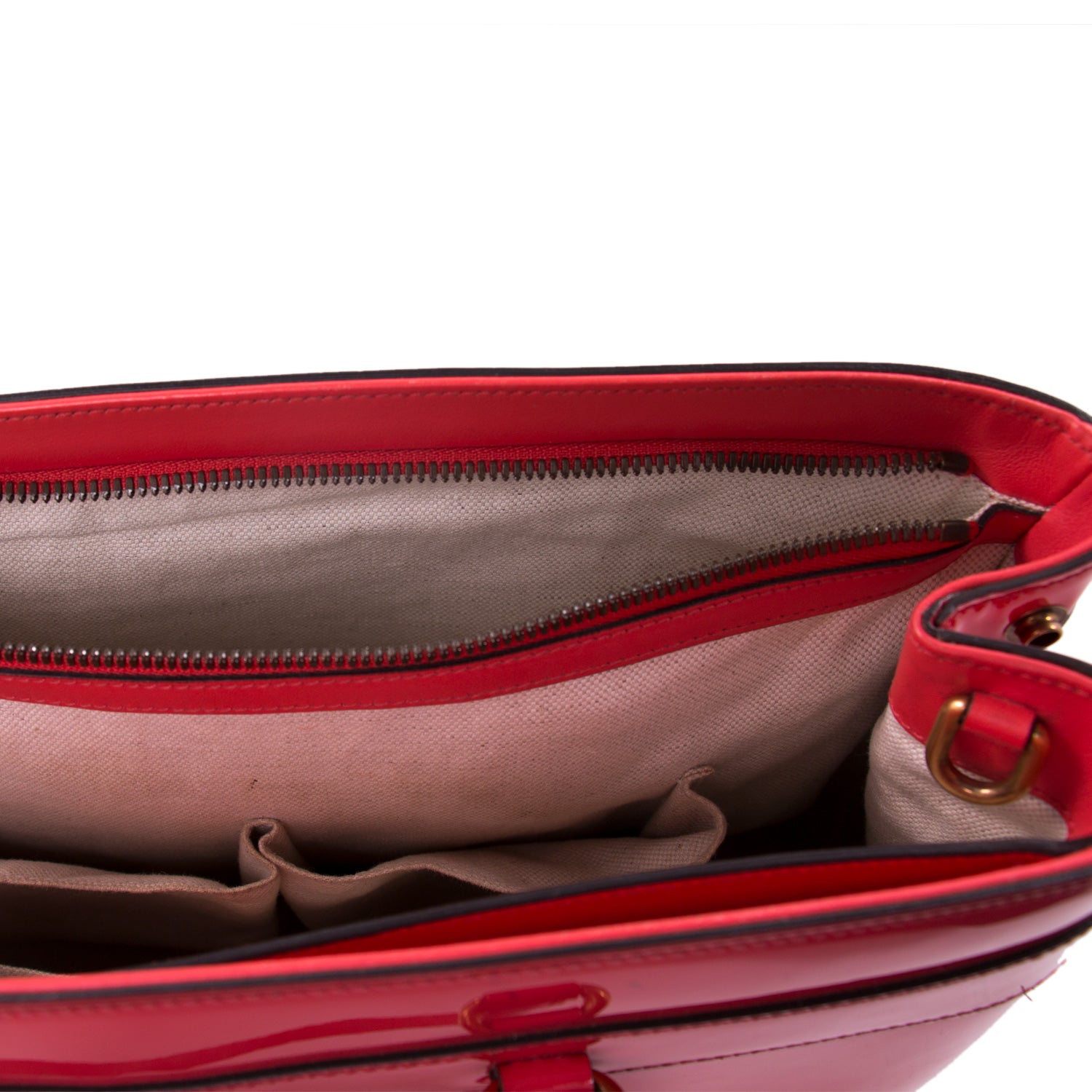 Details: Red Patent Leather / Gold-Tone Hardware / Dual Rolled Handles / Detachable and Adjustable Shoulder Strap / Horsebit Adornment at Front / Beige Canvas Lining / Three Compartments / Four Pockets at Interior, One with Zipper / Open Top