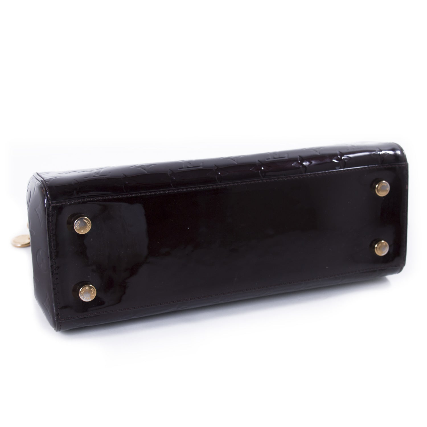 Details: Amarante Monogram Vernis Patent Leather/ Gold Tone Hardware / Dual Handles / Detachable and Adjustable Shoulder Strap / Vachetta Leather Trim / Fabric Lining / Dual Slit Pockets and Zipper Pocket at Inside / Zip Closure at Top